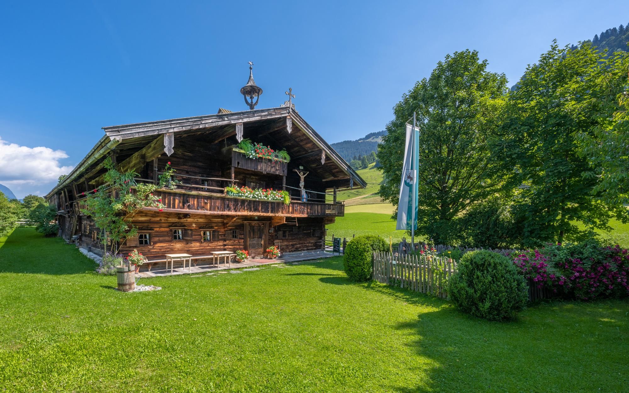 Umgeben von saftigen Wiesen und grünen Wäldern liegt langgestreckt der verwitterte typische salzburg-tirolerische Einhof mit seinen Nebengebäuden, wie Waschküche, Kapelle, Backofen, Bienenhütte und Tenne. Eine Fülle von Einrichtungsgegenständen, Gerätschaften und Werkzeugen gibt es zu besichtigen – der Besuch lohnt sich!