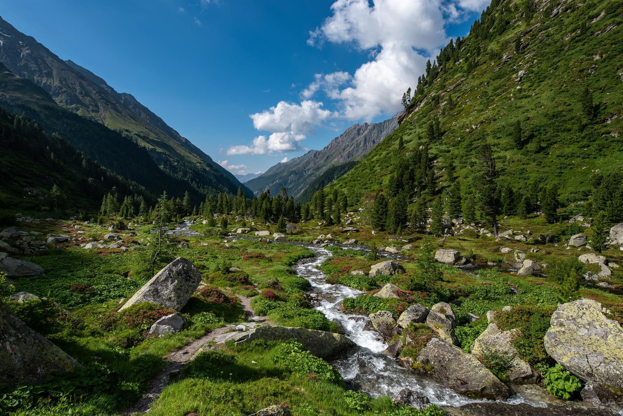 Tosende Wasserfälle, bachbegleitende Schotterfluren, Moore, ein sich in vielen Kurven talwärts schlängelnder Bach, Lärchenwälder und blütenreiche Wiesen, Gletscher und Seen, Gämsen und Steinböcke, aber auch Adler, Bartgeier, Wasseramsel, Murmeltiere und eine Vielzahl von Schmetterlingen sind zu beobachten.