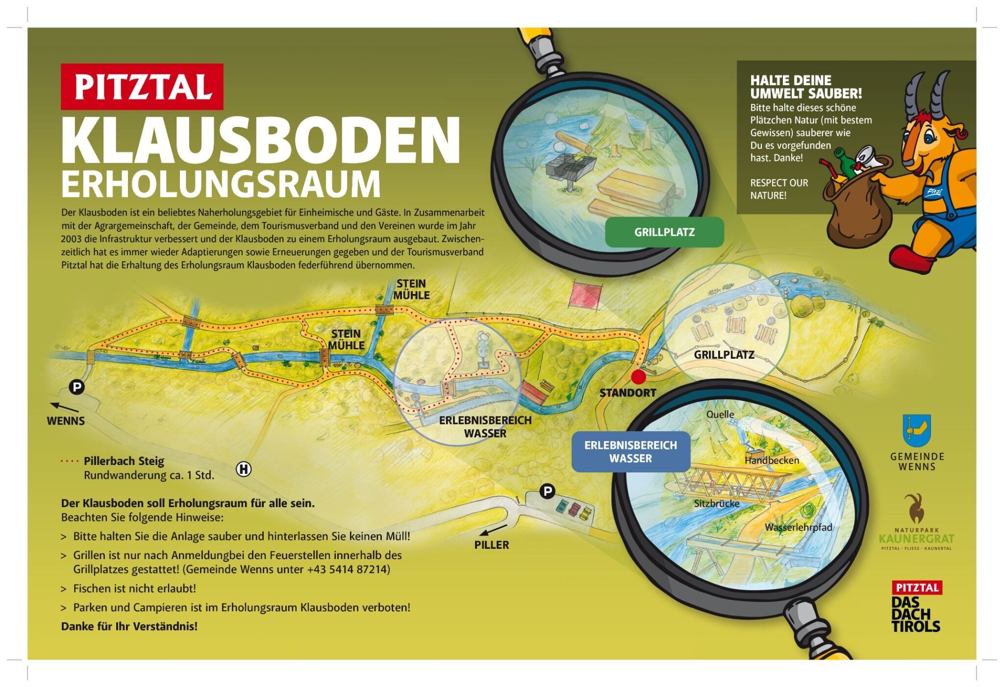 Nehmen Sie den Bus bis zur Haltestelle Wenns Moosanger und wechseln Sie die Straßenseite. Nach der Überquerung dem gelben Wanderschild Klausboden-Runde folgen, oder Sie wandern 500m Richtung seitlich der L17 Richtung Piller bis Sie den Parkplatz Klausboden inkl. Übersichtstafel erreichen. Sie können auch den Bus eine Haltestelle später H: Piller Taschach verlassen und 350 m seitlich der L17 bergab bis zum Parkplatz Klausboden wandern.