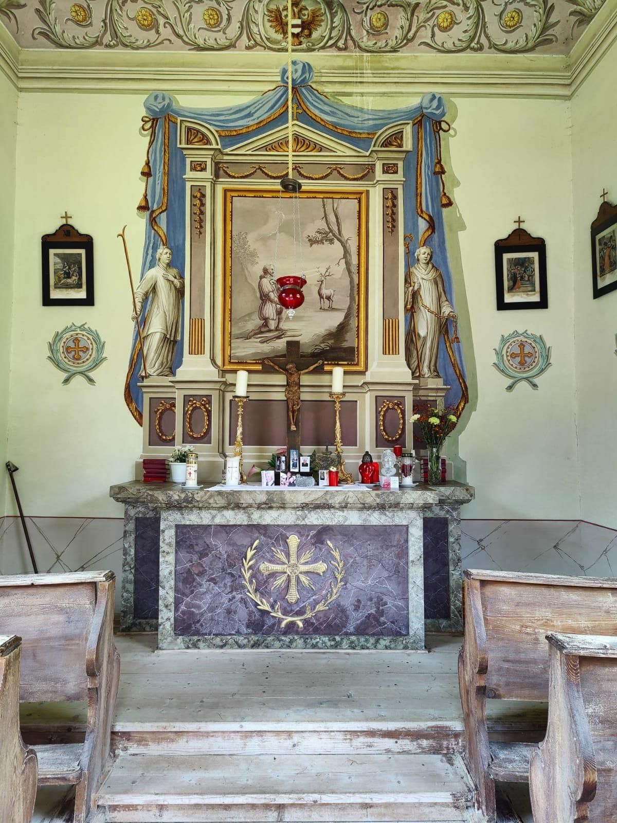 Die Kapelle wurde im Zuge des Klausenbaues 1837 errichtet. Bei einer Renovierung 1987/1988 wurde unter der Holzdecke eine Bemalung freigelegt. Auch Hubertus Kapelle genannt, der klassizistisch bemalte Altar zeigt den hl. Hubertus.