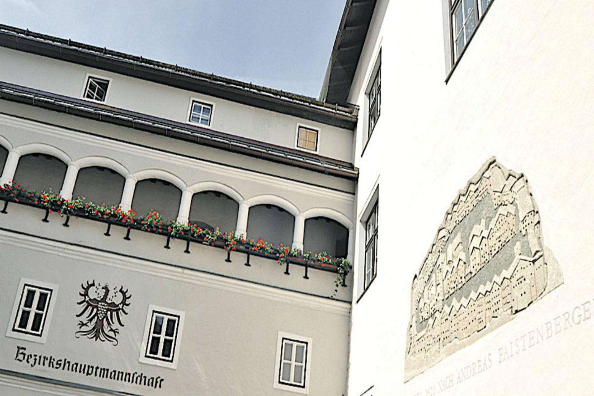 Das Graffito befindet sich im Hof der Bezirkshauptmannschaft, Hinterstadt.