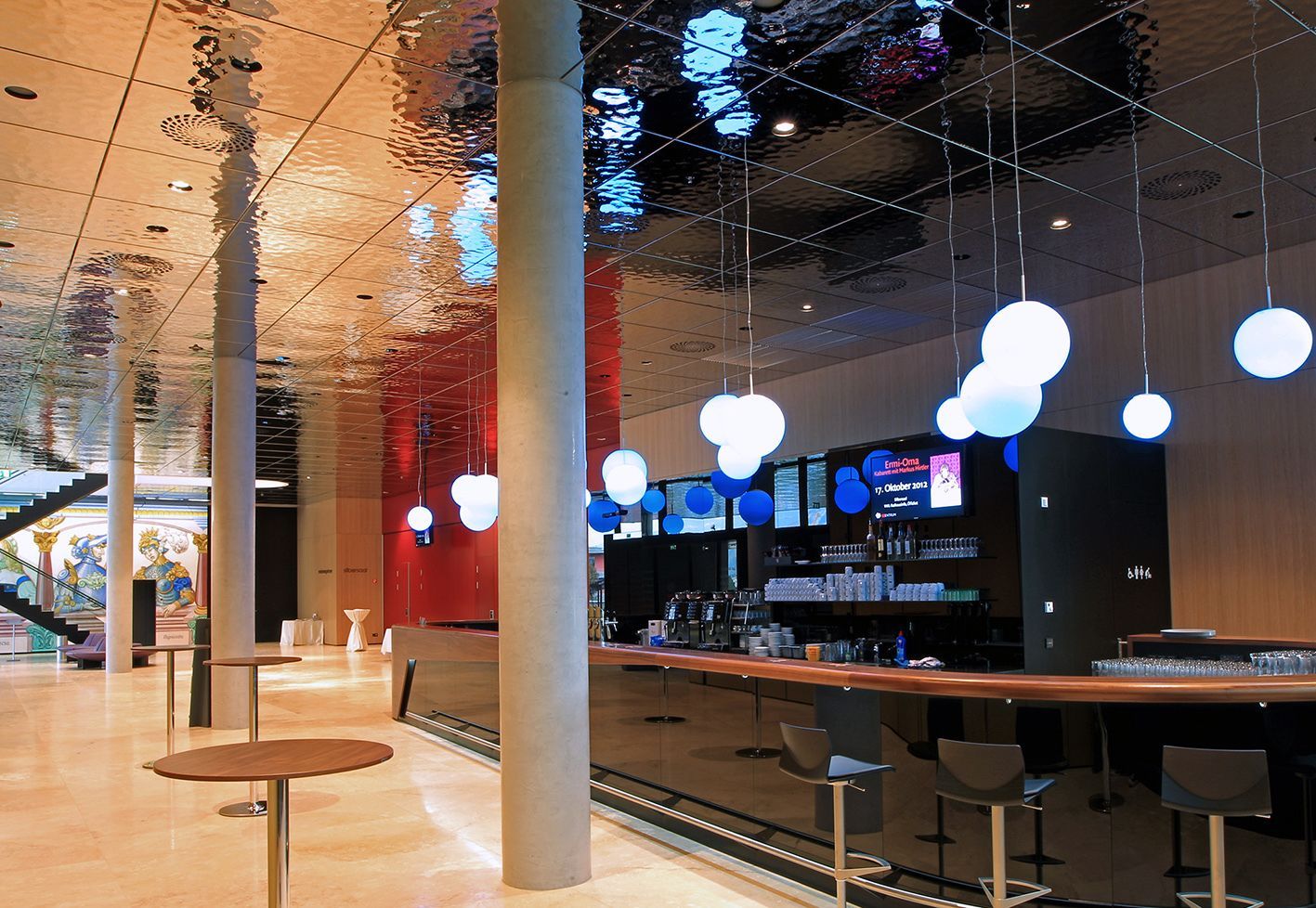 Das Meistersinger-Foyer fungiert als kommunikative Drehscheibe zwischen Hauptsaal, Seminarraum, der Tabak-Lounge im Obergeschoss, sowie der Gastronomie. Als Veranstaltungsort ist die „Tabak-Lounge“ auch separat buch- und bespielbar.