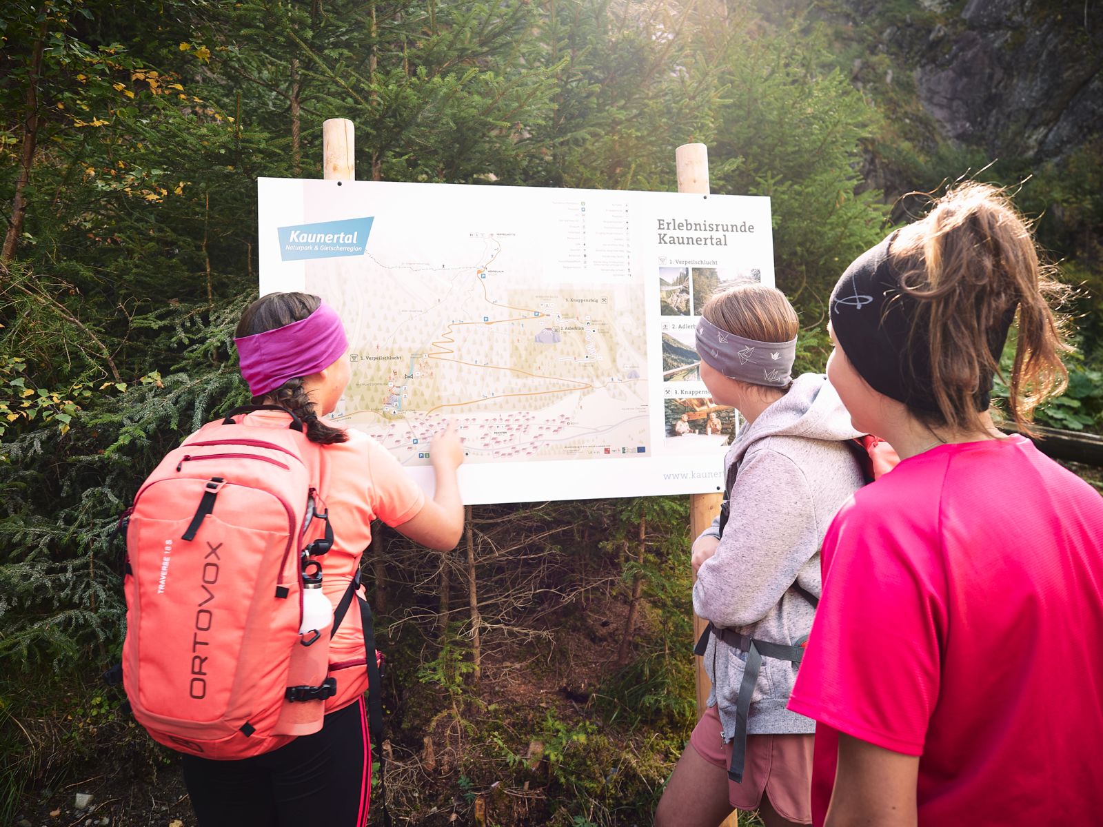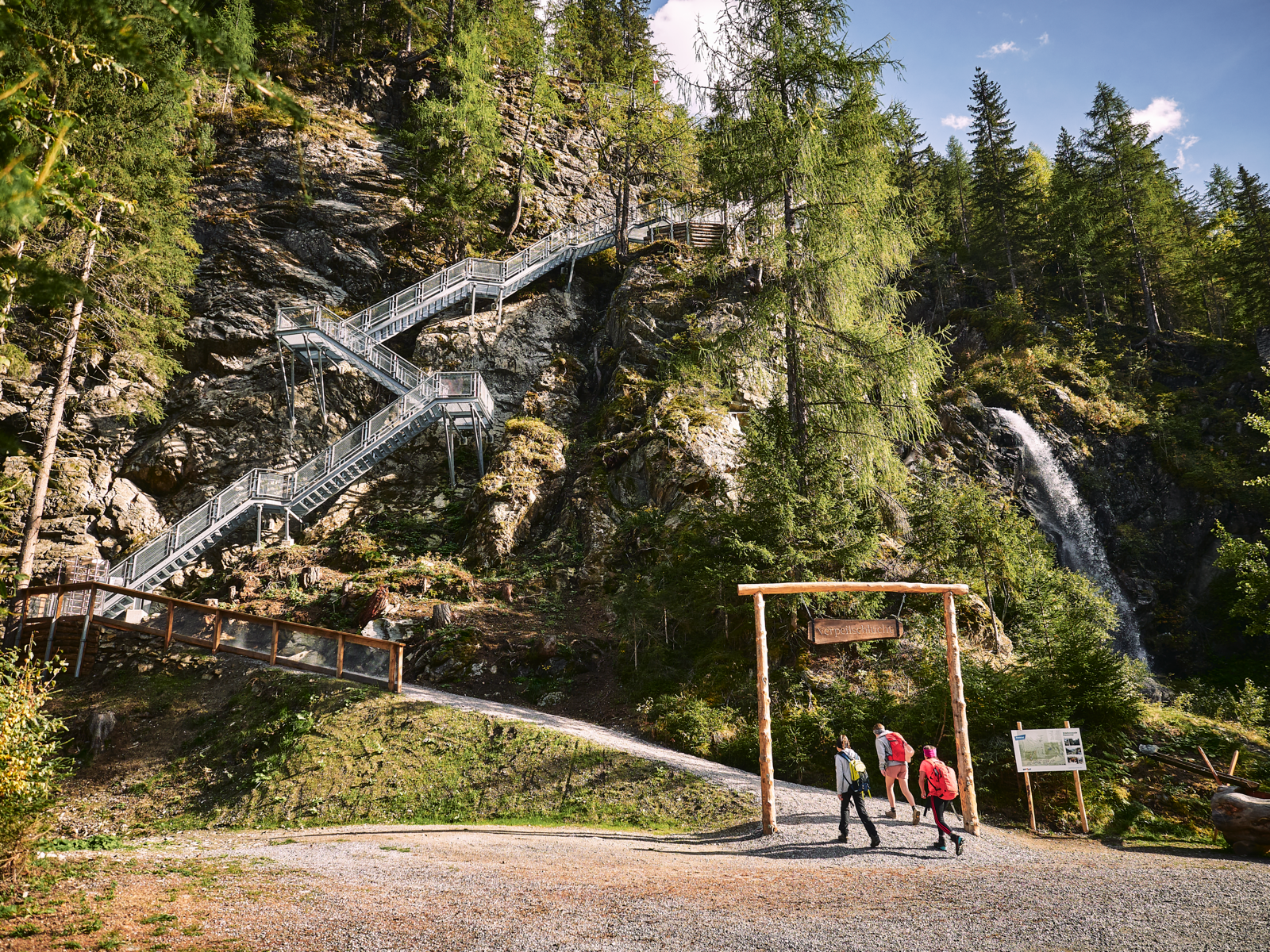 Wilde Schluchten, tosende Wasserfälle und Wanderer mittendrin. Erlebnis Kaunertal: Gesundheit - Natur - Kultur. Eine weitere Sommerattraktion steht mit der Erschließung der Verpeilschlucht seit Sommer 2021 den Besuchern des Kaunertales zur Verfügung. Was bereits erfolgreich mit dem Bau der Aussichtsplattform "Adlerlbick" und den Knappensteig begonnen hat, wurde nun mit der Verpeilschlucht abgerundet.