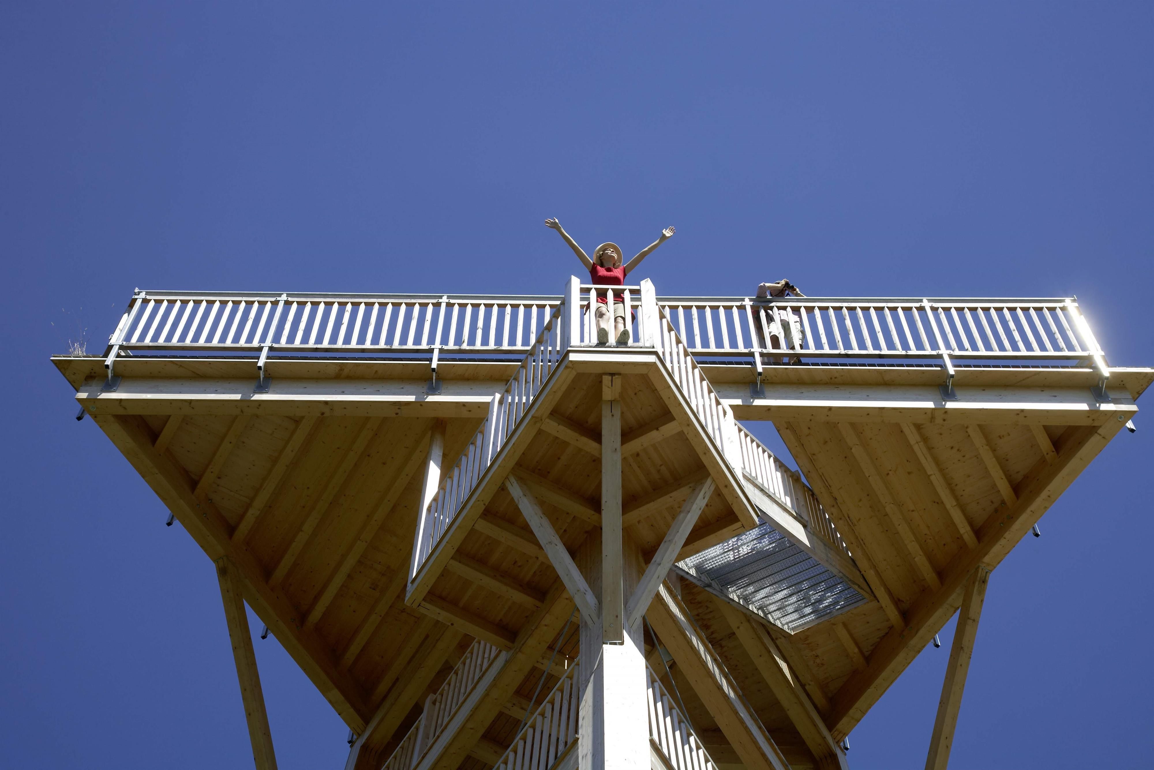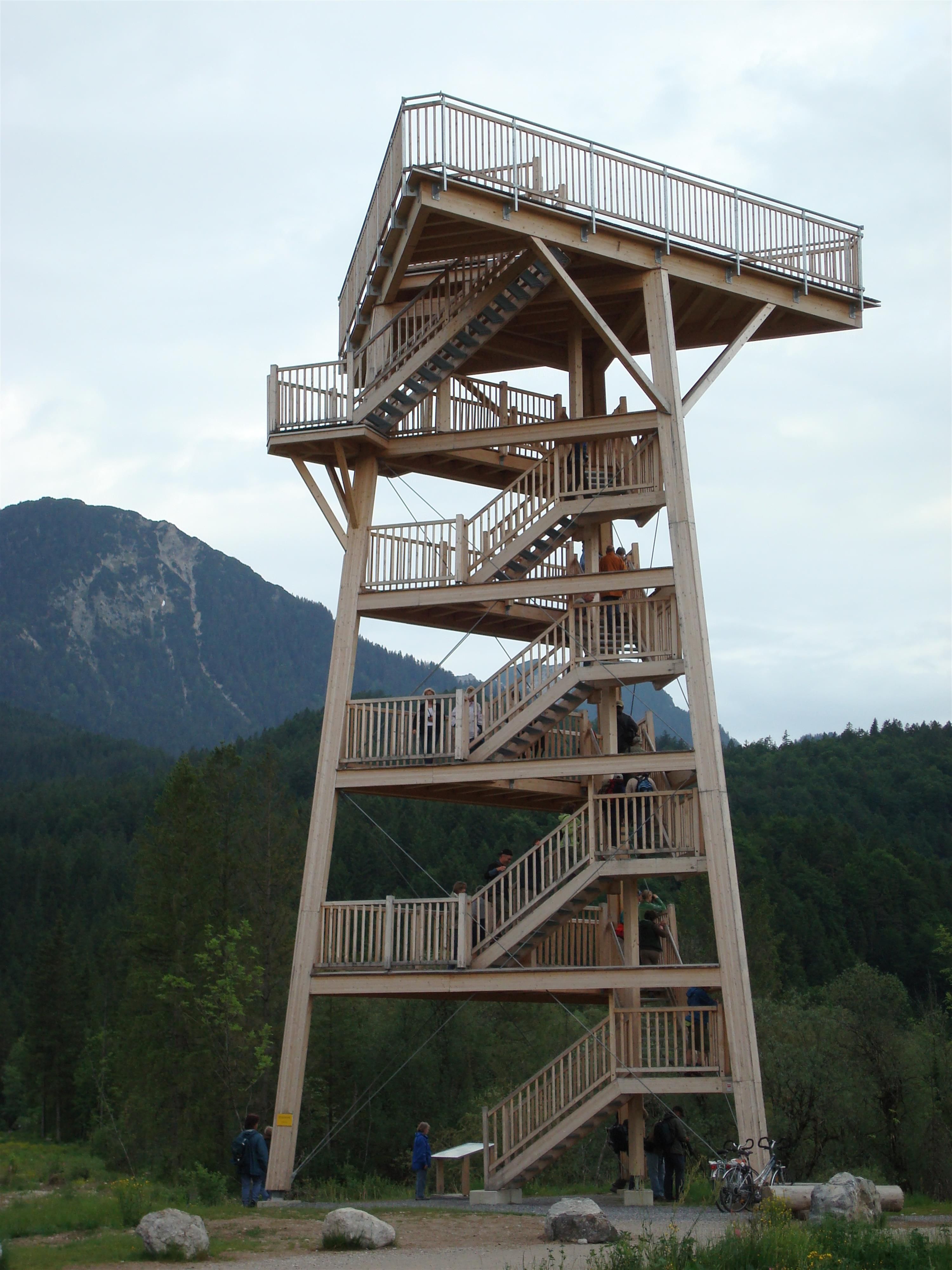 Der imposante 18 m hohe Vogelbeobachtungsturm liegt am Lechweg. Eine Vielzahl in Tirol vorkommender Brutvogelarten, darunter einige seltene Sumpf- und Wasservögel, können hier beobachtet werden. Die abwechslungsreiche Landschaft mit ihren zahlreichen Tümpeln und Stillgewässern stellt ein kleines Paradies für die Vogelwelt dar.