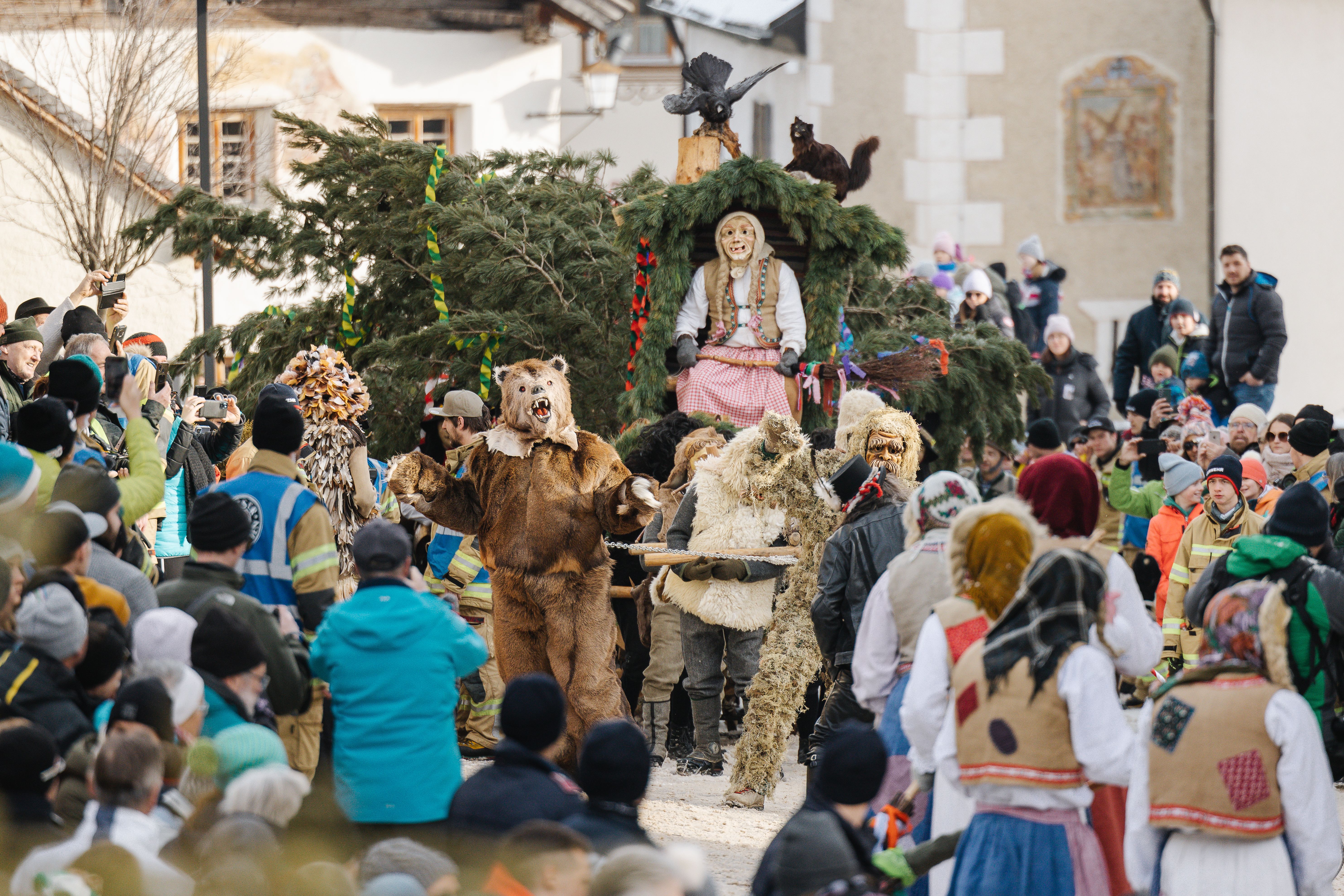 Der Weg durch das Dorf ist eine einzige, symbolische Kraftprobe. Die einen ziehen für den kommenden Frühling, während Teufel und Hexen alles daransetzen, ein Weiterkommen zu verhindern. Es ist ein fesselndes Hin und Her, das schließlich am Dorfplatz seinen Höhepunkt findet. Dort wird die mächtige Zirbe am Ende des Tages versteigert. Das sorgt für spannende Bietergefechte und einen willkommenen Erlös, der der Dorfgemeinschaft zugutekommt.