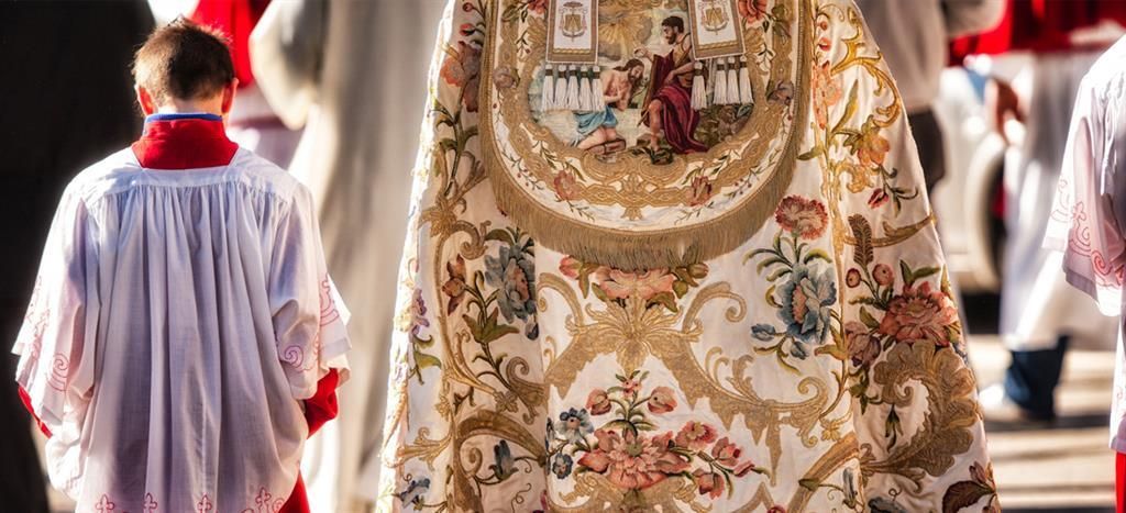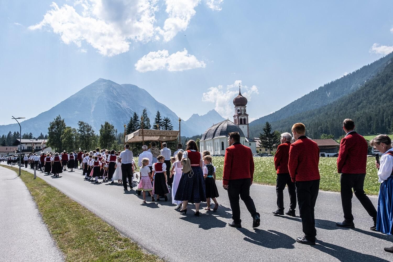 Gemeinsamer Einzug in die Pfarrkirche zur Hl. Messe. Anschließend Prozession mit feierlicher Gestaltung durch die Steinrösler Sänger und der Musikkapelle Leutasch.