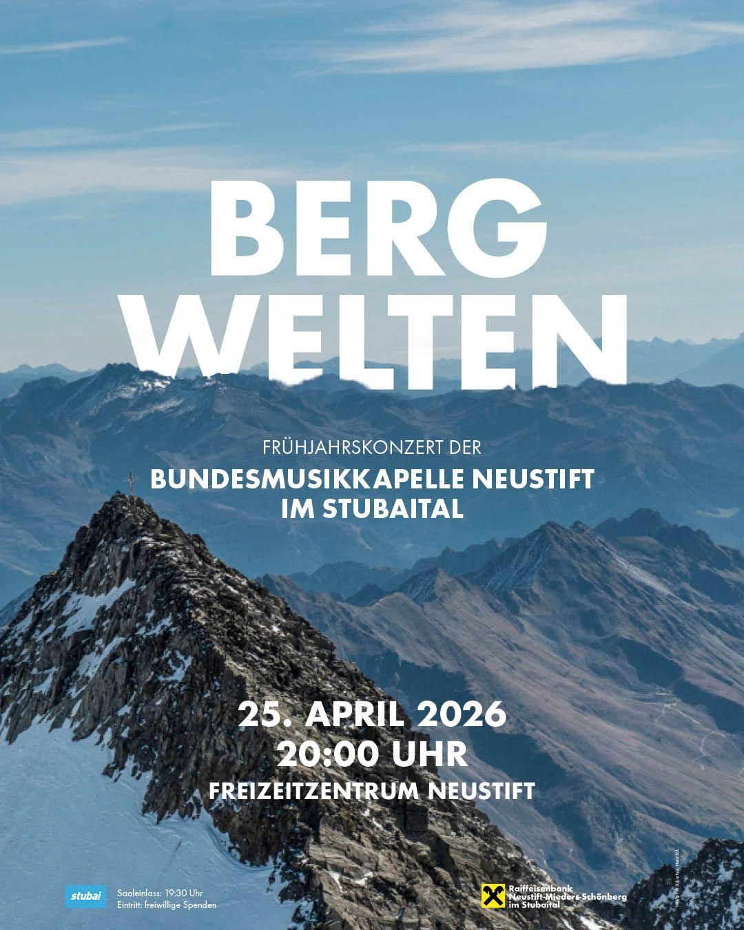 Frühjahrskonzert „Bergwelten“ Samstag, 25. April 2026 Beginn: 20:00 Uhr Saaleinlass: 19:30 Uhr Ort: Freizeitzentrum Neustift