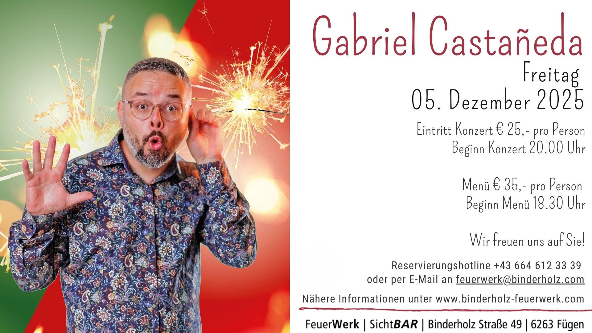 Scharfsinnig, schräg & saukomisch: Gabriel Castañeda nimmt Weihnachtsbräuche, Bibelgeschichten und absurde Traditionen aufs Korn – mit bissigem Humor, verrückten Songs und jeder Menge Lacher. Menü: € 35,00 pro Person - Beginn 18.30 Uhr. Eintritt Konzert: € 25,00 pro Person - Beginn 20.00 Uhr. Reservierung unter +43 664 612 33 39 oder per E-Mail an feuerwerk@binderholz.com.