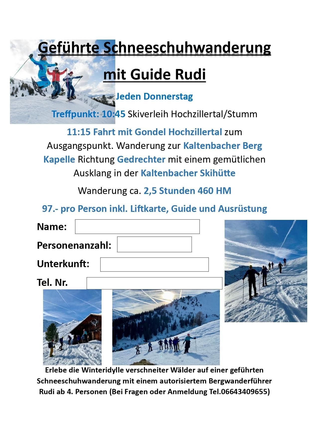 Treffpunkt um 10.45 Uhr beim Skiverleih Hochzillertal, um 11.15 Uhr Gondelfahrt (Ski Optimal Hochzillertal) zum Ausgangspunkt. Wanderung zur Kaltenbacher Bergkapelle Richtung Gedrechter mit gemütlichem Ausklang in der Kaltenbacher Skihütte.