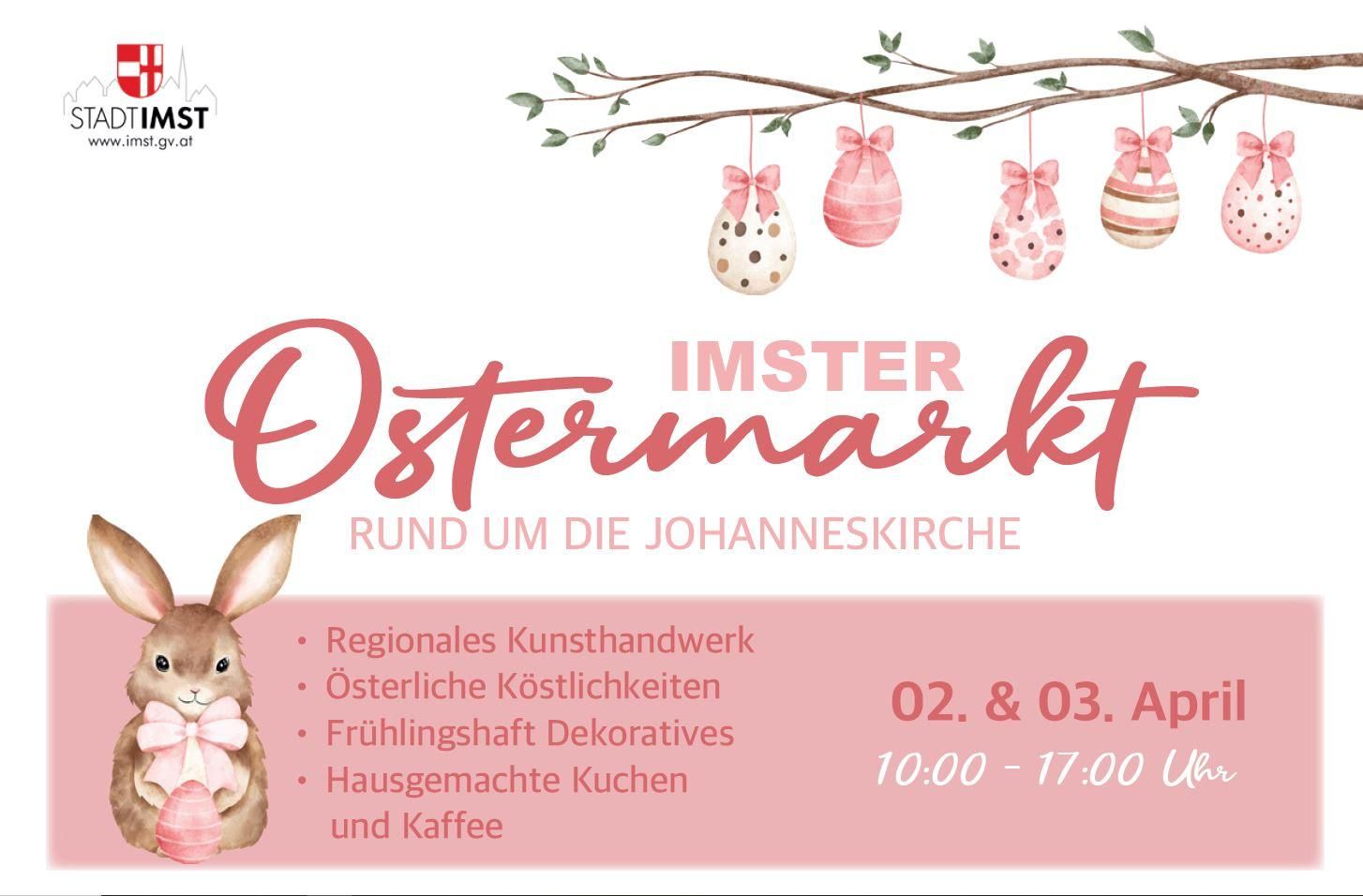 Am Gründonnerstag, und Karfreitag, findet rund um die Johanneskirche wieder der traditionelle Imster Ostermarkt statt. Rund 20 Markttreibende bieten regionales Kunsthandwerk und österliche Kostbarkeiten zum Verkauf an. Für das leibliche Wohl ist ebenfalls bestens gesorgt. In der Kinderwerkstatt können zudem Ostereier gefärbt werden.