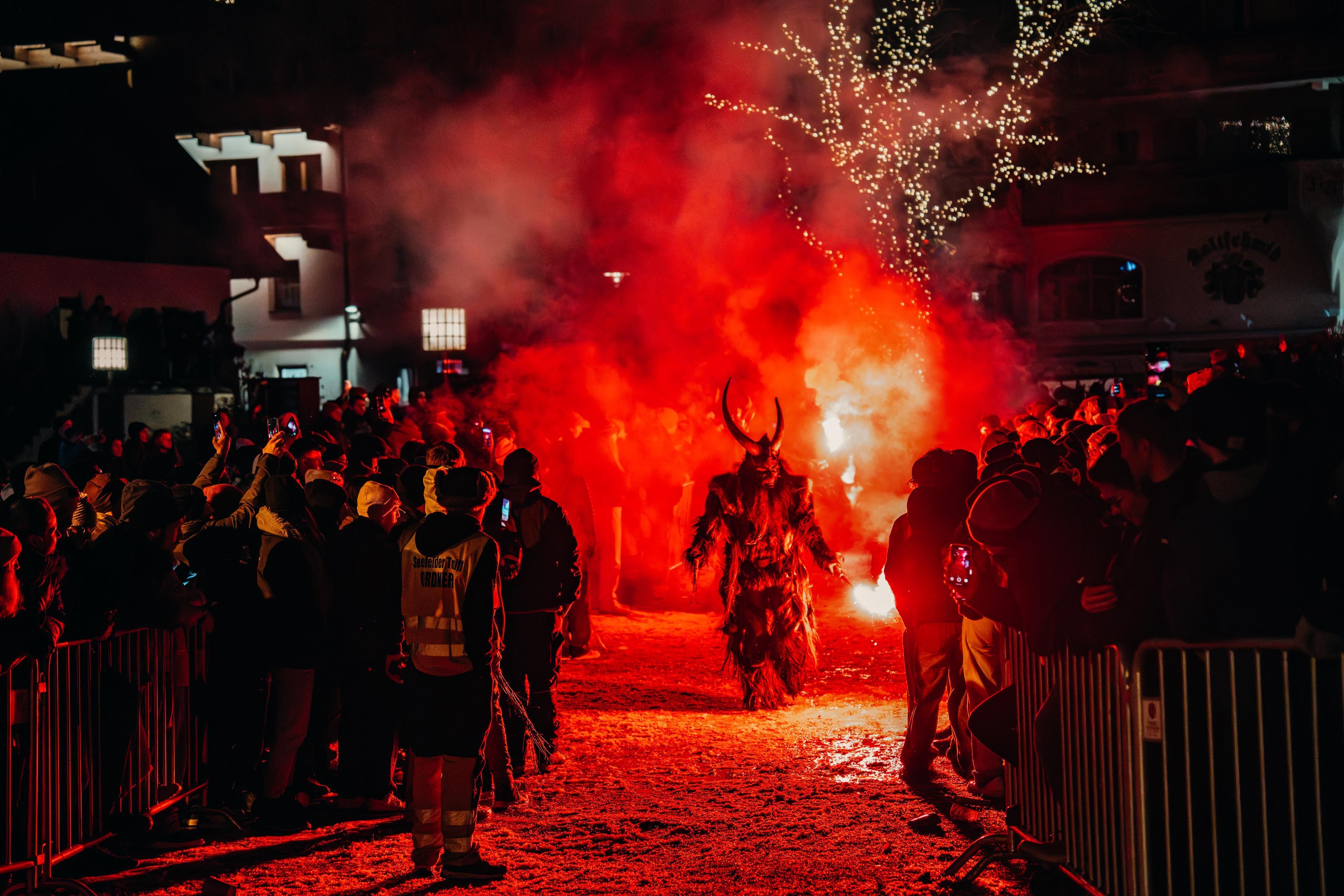 Wer schon einmal einen Krampuslauf in Seefeld erlebt hat, weiß, dass es hier ein wenig traditioneller zugeht, als bei manch anderem Krampuslauf. Zwar werden bengalische Feuer entzündet und kleinere Showeinlagen gezeigt, die Tuifl bleiben dabei aber ganz Krampus und greifen auch schon mal zur Rute, um dem ein oder anderen Mutigen und Frechen eine mitzugeben. „Natürlich wird nicht fest gehauen“ erklärt Daniel (Danny) White, der das Krampustreiben in Seefeld seit rund 15 Jahren organisiert. Alles habe Maß und Ziel. „Doch vor allem bei den jugendlichen Besuchern soll schon der Nervenkitzel bleiben, erwischt mich der Krampus heut‘ oder nicht.“