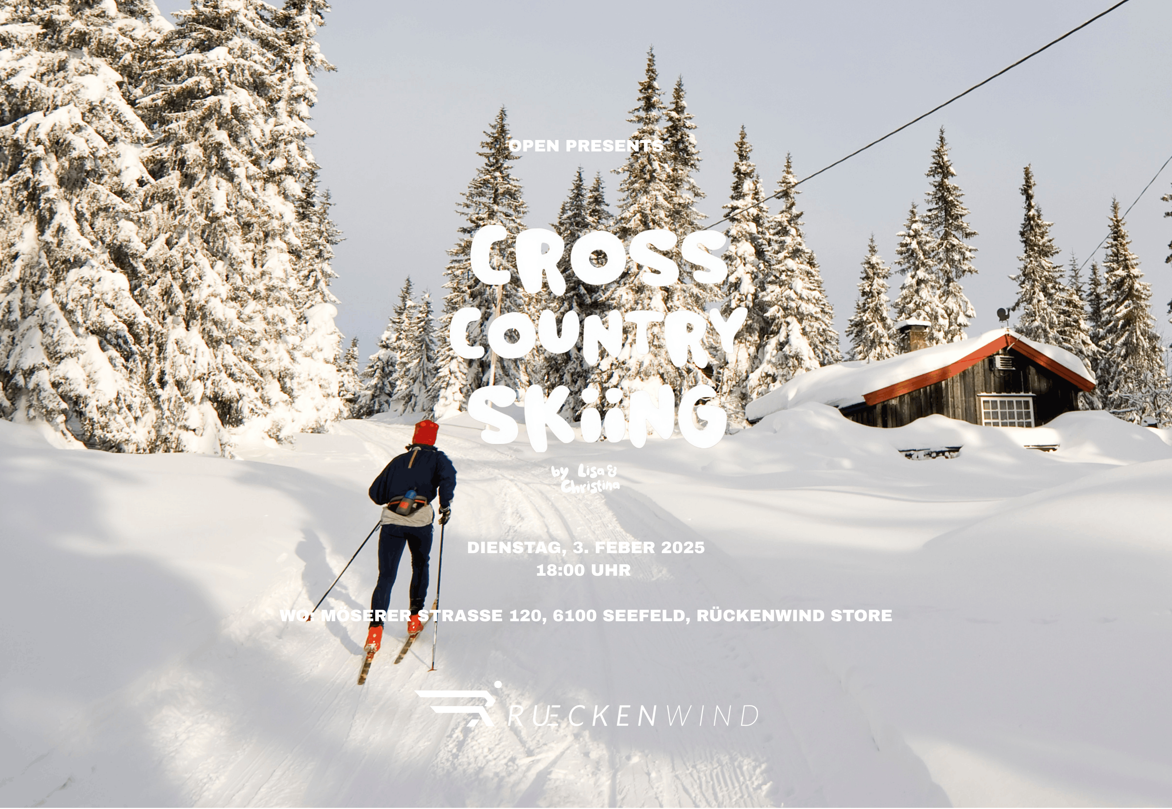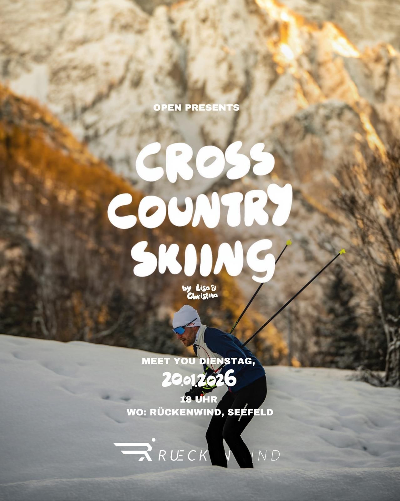 Wir starten gemeinsam als Open-Community in eine entspannte Langlauf-Session in Seefeld. Zum Start lernen wir uns ganz locker kennen, bevor wir gemeinsam auf die Loipe gehen. Falls du noch keine Langlauf-Ausrüstung hast, kannst du diese direkt vor Ort im Rückenwind Shop zu vergünstigten Konditionen ausleihen. Wichtig: Eine Loipenkarte wird benötigt (kann vor Ort per Bar- oder Kartenzahlung erworben werden).