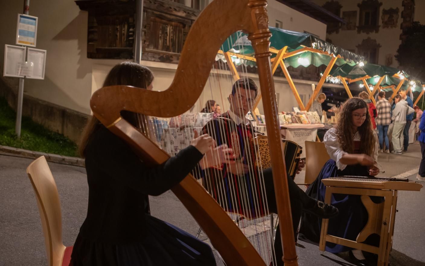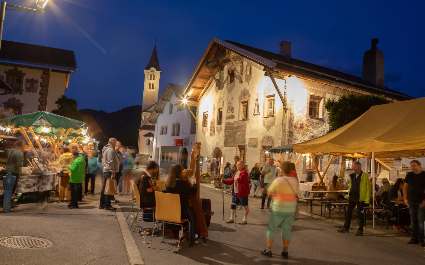 Erleben Sie einen unvergesslichen Abend im historischen Dorfzentrum von Ladis inmitten seiner denkmalgeschützten und freskenbemalten Gebäude. Flanieren Sie durch das geschichtsträchtige Zentrum, genießen Sie kulinarische Köstlichkeiten und Musikdarbietungen.