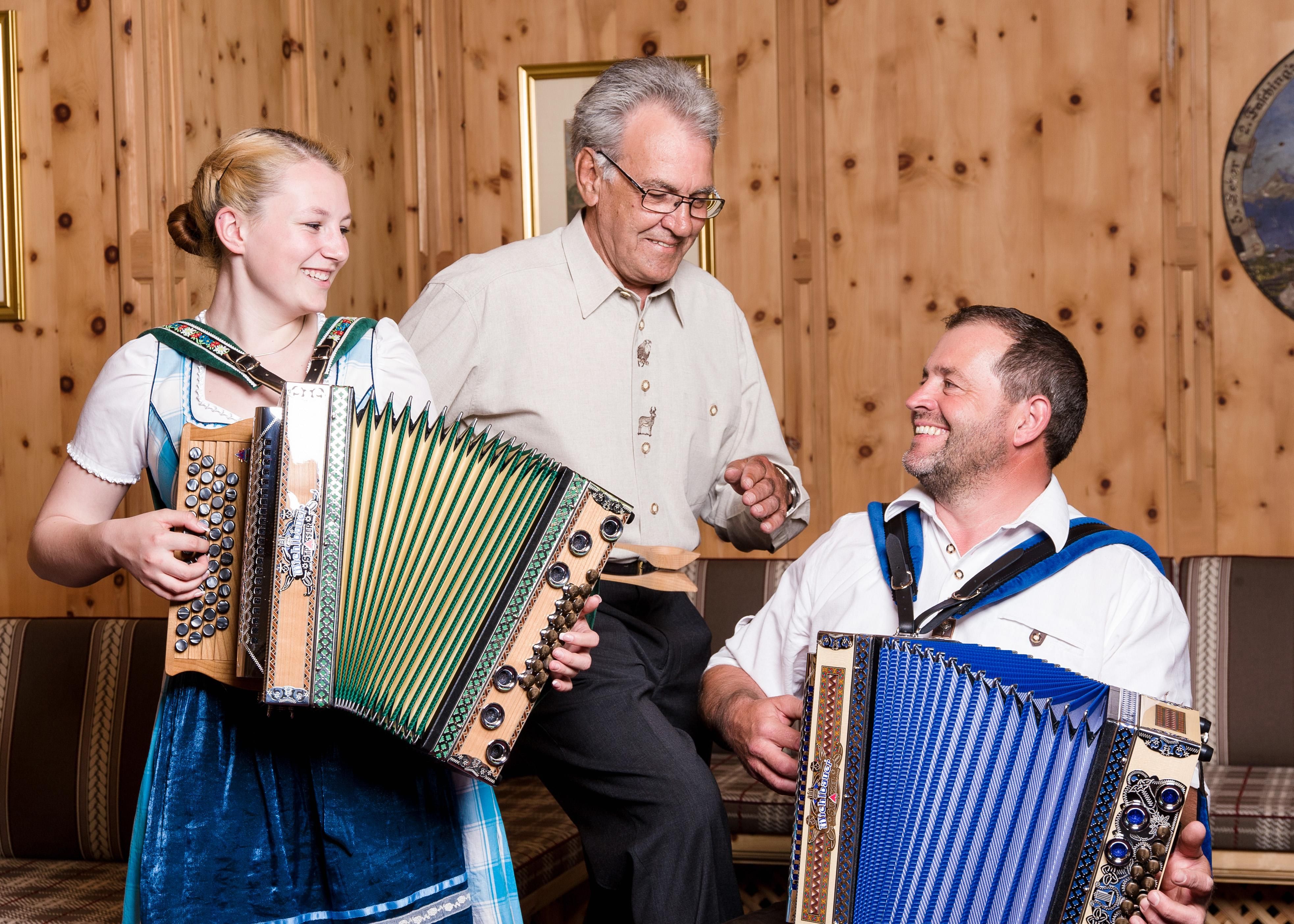 Die Steirische Harmonika ist das bekannteste Musikinstrument im Alpenraum und gehört zu einem Tirol-Urlaub einfach dazu. Egal ob auf einer Almhütte, am Lagerfeuer, beim gemütlichen Abendessen oder zu Festlichkeiten – der besondere Klang der Steirischen Harmonika ist immer passend und erfreut Jung und Alt mit herzerfrischender Volksmusik.