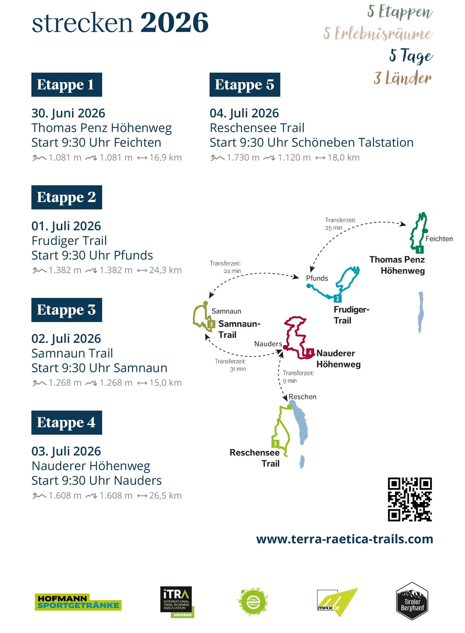 Ein völlig neues Format im Trailrunning, das ein bisschen an eine Tour de France erinnert. Man läuft die schönsten Trailrunning-Strecken der 5 Erlebnisregionen Kaunertal, Tiroler Oberland, Engadin, Nauders und Reschensee – alle zwischen 15 – 27 km und 1100 – 1700 hm. Es gibt bei uns mit Sicherheit kein Event, das landschaftlich so attraktive und abwechslungsreiche Strecken hat. Ein absolutes Highlight für jeden Trailrunner.