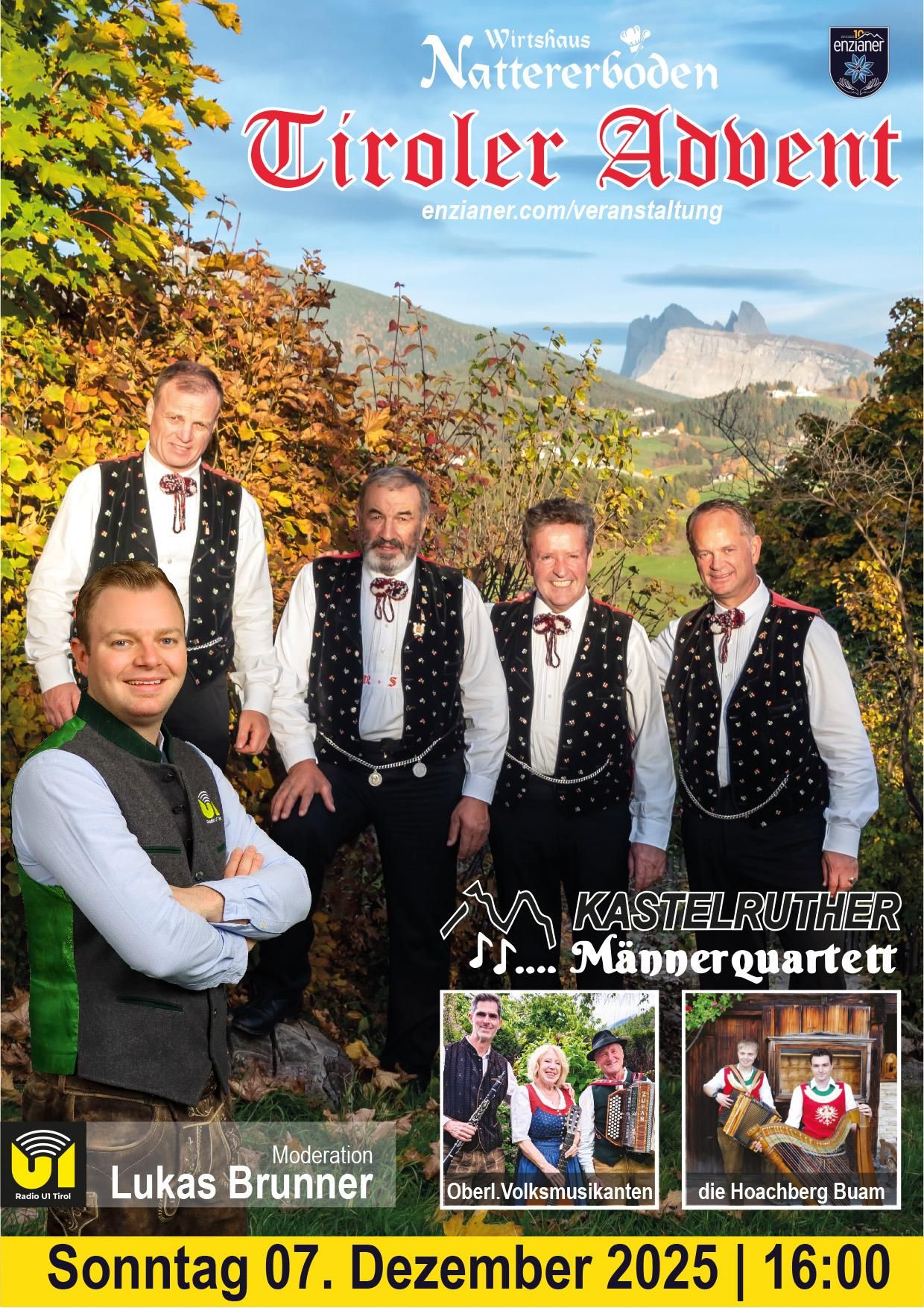 Der „Tiroler Advent der enzianer“ mit Benefizhintergrund findet am Sonntag den 07. Dezember 2025 um 16.00 Uhr im Wirtshaus Natterrerboden statt.