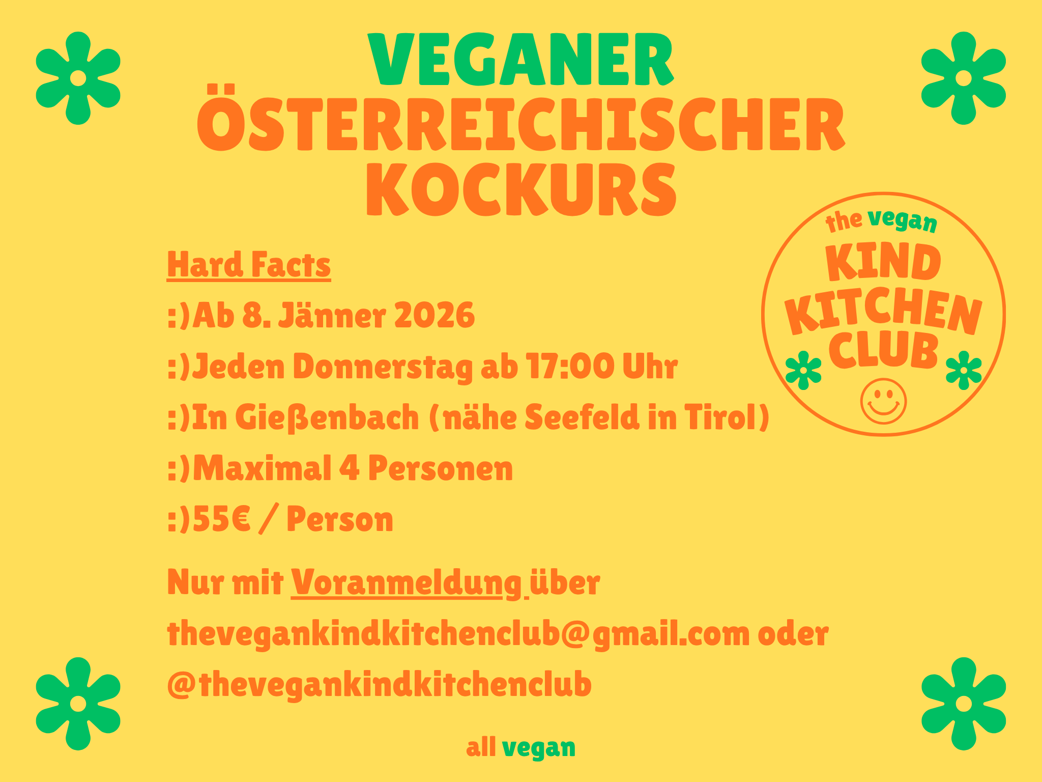 Für maximal 4 Personen pro Kurs / Possible in English. Preis pro Person € 55,-. Nur mit Voranmeldung über thevegankindkitchenclub@gmail.com.