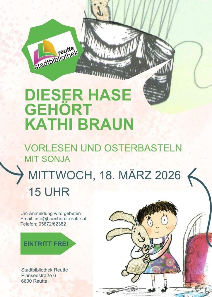 Vorlesen und Osterbasteln mit Sonja / Eintritt frei / Freut euch auf einen vergnüglichen Nachmittag mit einer netten Geschichte und Basteleien rund um die Osterzeit / Wir bitten um Anmeldung (max. 20 Kinder) : +43 5672 62382 oder info@buecherei-reutte.at