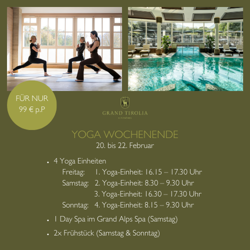 Gönnen Sie sich eine entspannte Auszeit für Körper und Geist inmitten der Kitzbüheler Bergwelt. Beim Yoga-Wochenende im Grand Tirolia erwarten Sie vier wohltuende Yoga-Einheiten, kombiniert mit Genuss und Tiefenentspannung im Grand Alps Spa. Kosten pro Person EUR 99,00.