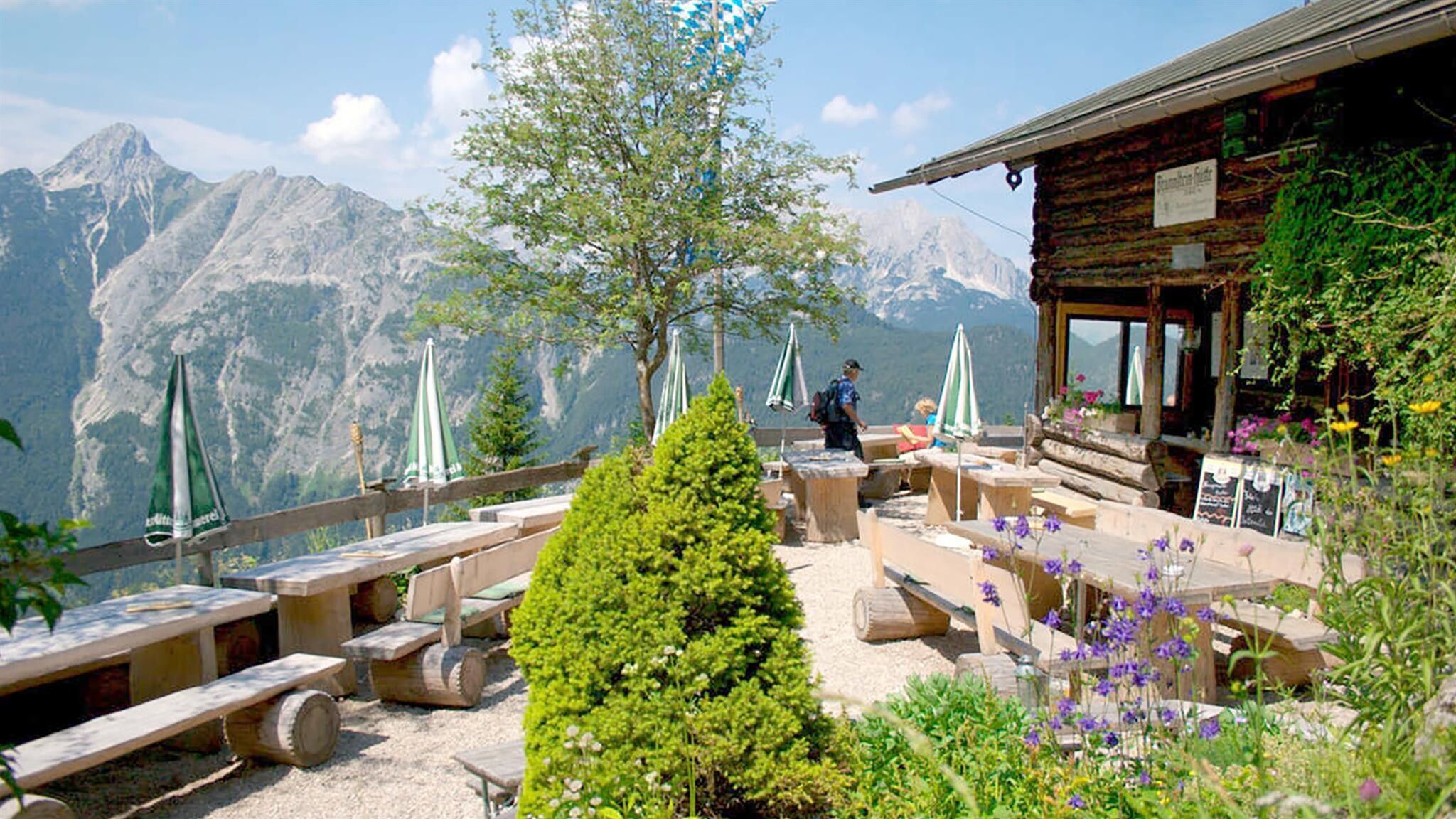 Aussichtsreiche Familienhütte mit Spielplatz, Streichelzoo und Nachtplatz im westlichen Karwendelgebirge.