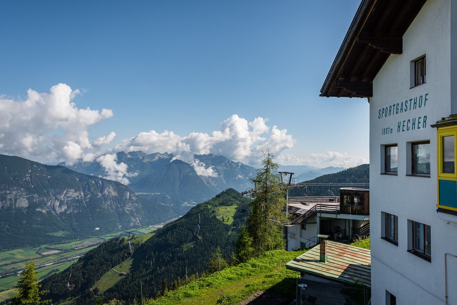 Das Hecherhaus liegt auf 1.887 m Höhe direkt an der Bergstation der Kellerjochbahn. Von hier eröffnet sich ein beeindruckender Blick über das Inntal und die Karwendelspitzen.