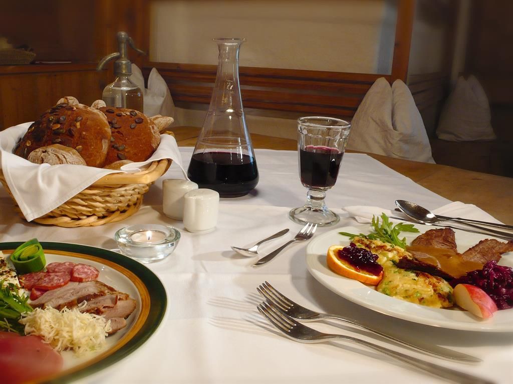 Ehrliche traditionelle Tiroler Küche – Köstlichkeiten aus hauseigenen und regionalen Produkten. Das Gemüse und die Kräuter kommen aus dem eigenen Garten, Kraut und Kartoffeln vom Feld, das Fleisch großteils vom eigenen Hof. Sogar das Brot wird stets frisch gebacken. Im Speisesaal funktioniert das Zusammenspiel von Design und entspannter Atmosphäre perfekt. Im Sommer auch fein im Gastgarten mit mediterranem Flair. Ein spannender Gegensatz zum Restaurant ist die gemütliche traditionelle Bauernstube. Mit viel Liebe wurde hier ein meisterliches Kleinod Jahrhunderte alter Tischlerkunst geschaffen.