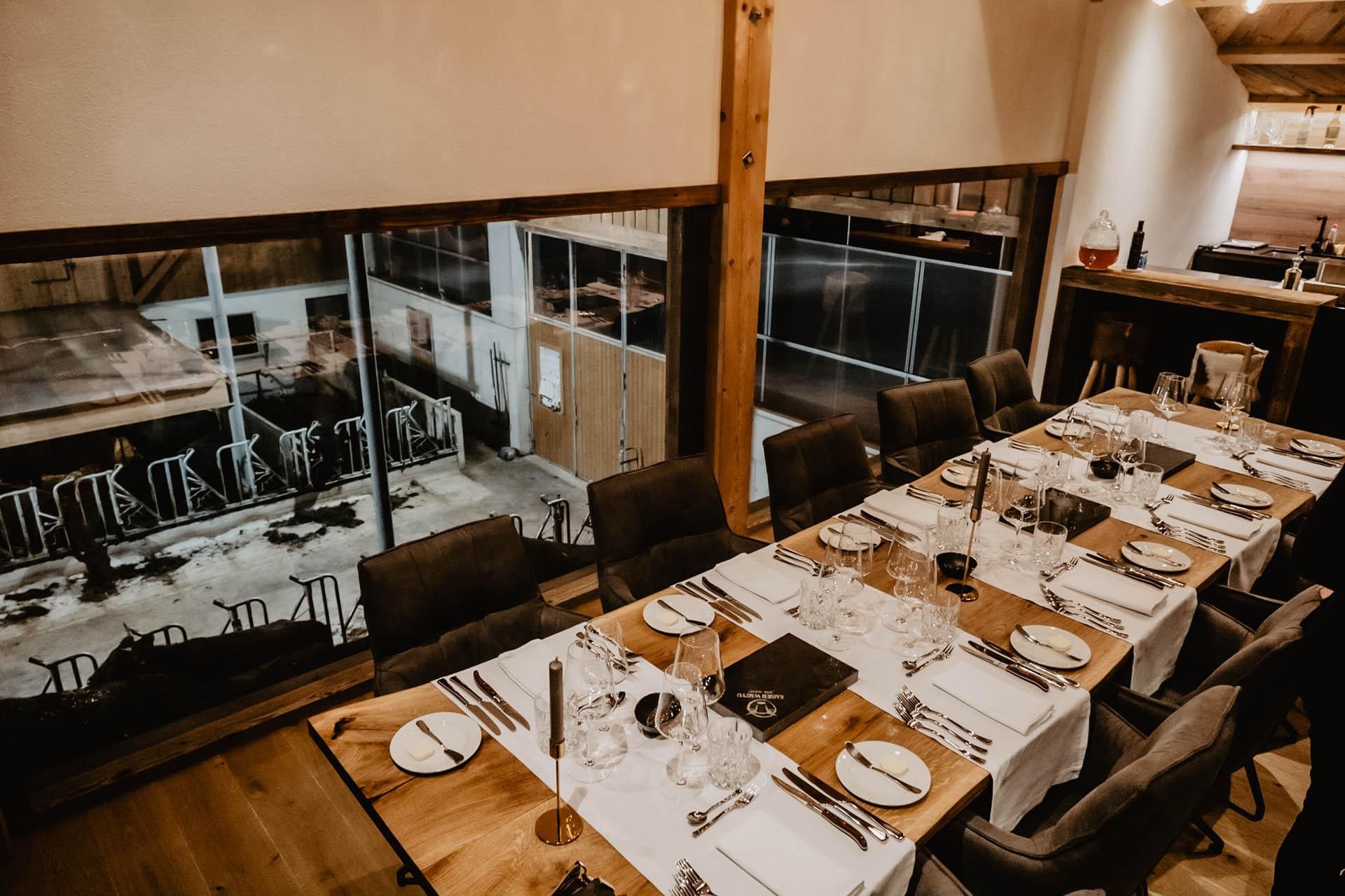 Das Ambiente im „The Stable“ Dining Room ist einzigartig. Auf der einen Seite blicken Sie auf den imposanten Wilden Kaiser, auf der anderen direkt in den Kuhstall – einfach phänomenal!