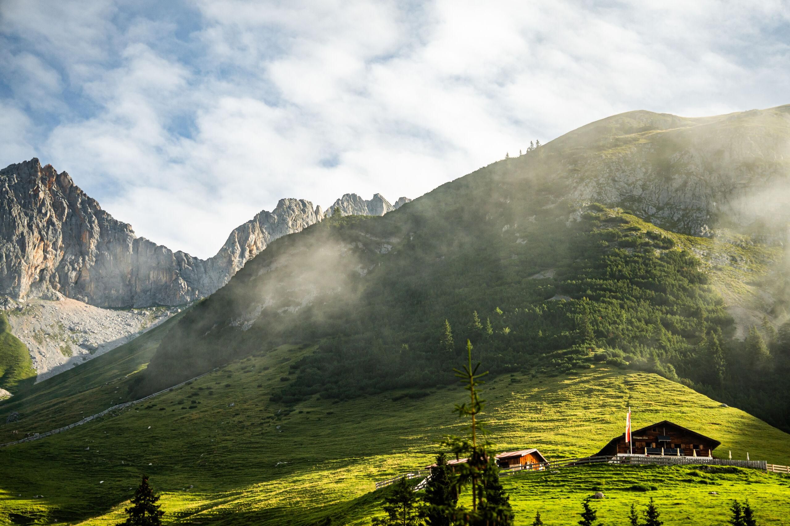 Die Wangalm im Gaistal unterhalb der Gehrenspitze besticht mit ursprünglicher Gemütlichkeit und einer authentischen Almwirtschaft auf 1.751 Metern über dem Meer. Von Anfang Juni bis Mitte Oktober gibt es für hungrige Wandergäste und (E-)Biker herzhafte Tiroler Köstlichkeiten und kühle Erfrischungen auf der Sonnenterrasse oder in der holzgetäfelten Gaststube.