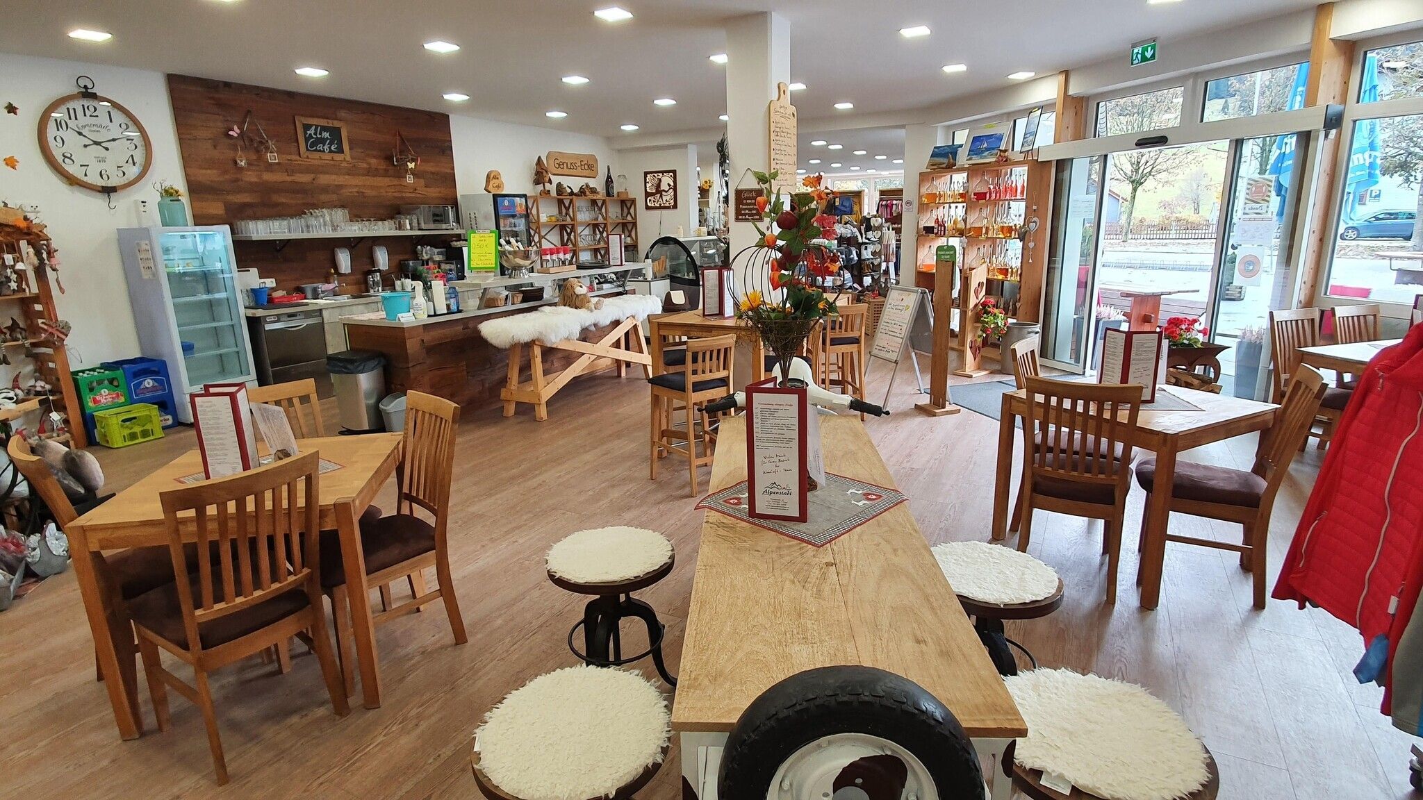 Das integrierte AlmCafé mit seiner Sonnenterrasse und der herrlichen Aussicht ist eine schöne Ergänzung zum Shoppen. Geniessen Sie neben Kaffee und Kuchen auch weitere Leckereien wie original italienisches Eis oder Cocktails. Somit wird Shopping zum Genuss.