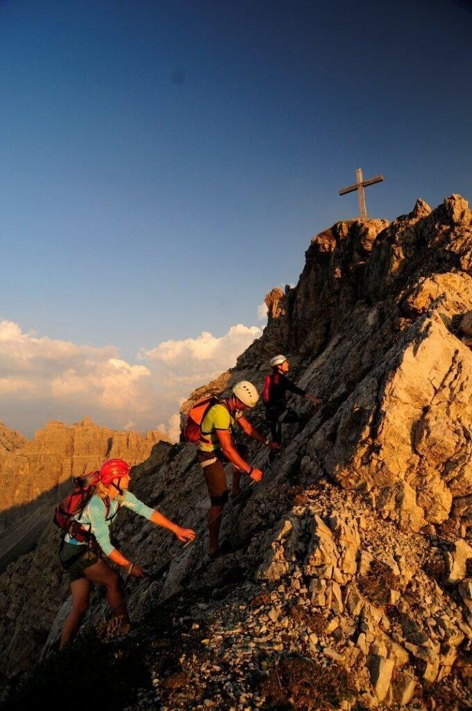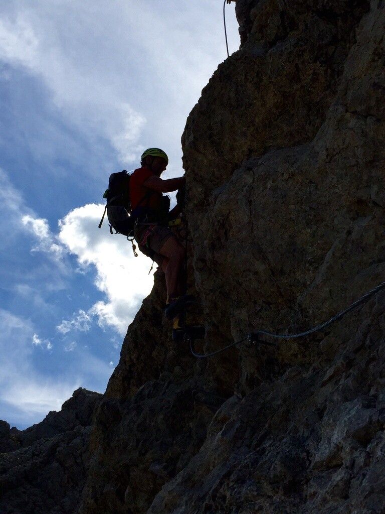 Vollständige Klettersteig-Ausrüstung (Klettersteigset, Gurt und Helm) auch für Geübte unbedingt empfohlen!