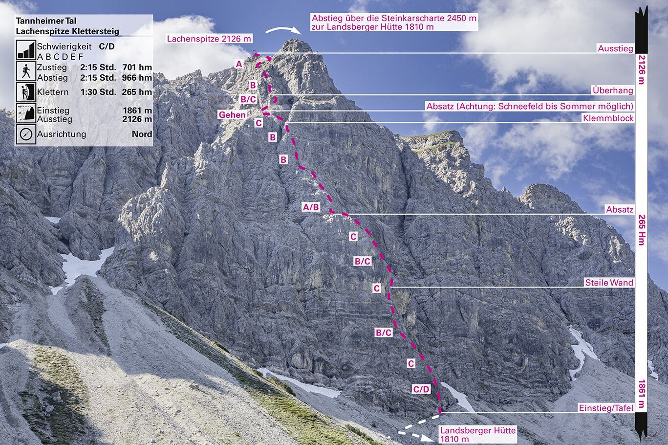 Ausgangspunkt ist der Vilsalpsee oder die Talstation Neunerköpfle in Tannheim. Von dort über die Landsberger Hütte (1.805 m) in ca. 2,5–3 Stunden Aufstieg zum Einstieg beim Lachesee. Der Weg ist markiert und führt über schöne Almlandschaften ins hochalpine Gelände.