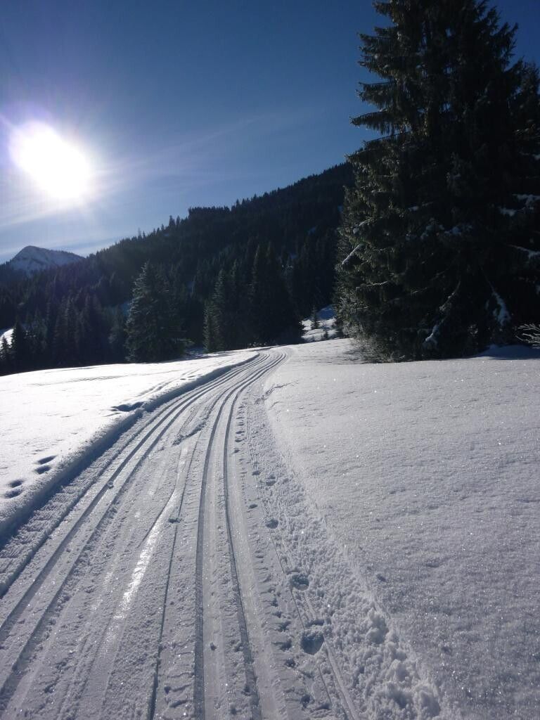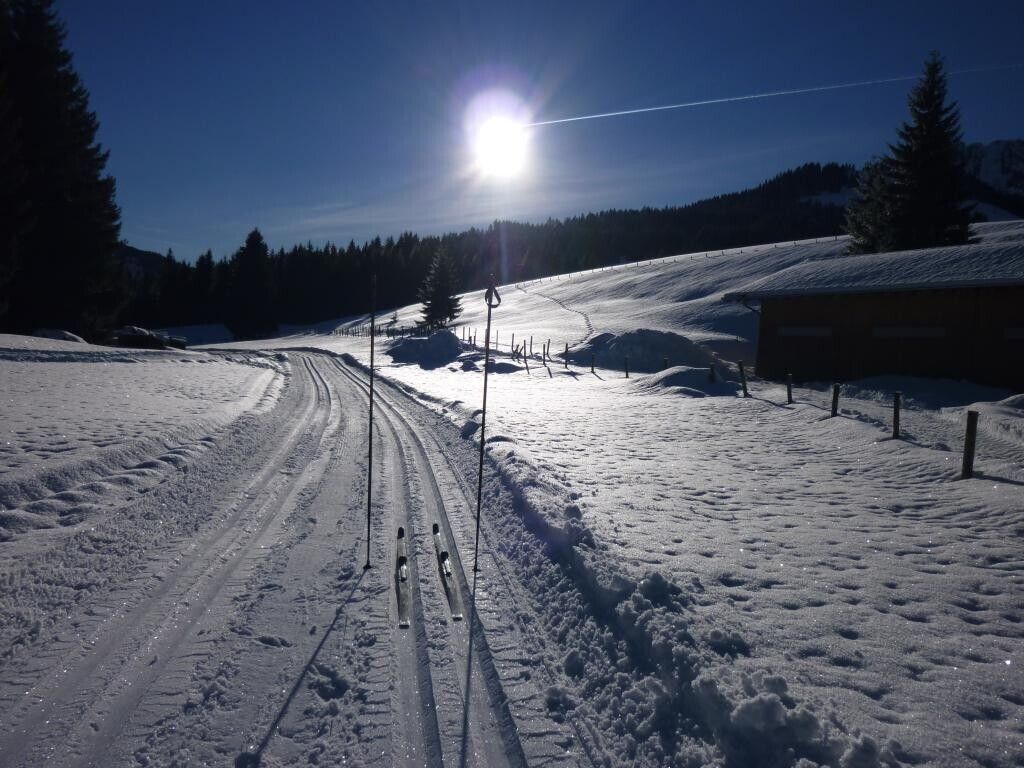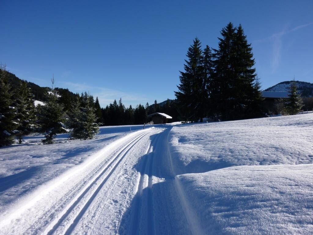 Wegbeschreibung:Direkt am Parkplatz im Jungholzer Ortsteil Langenschwand geht es los. Leicht abwärts führt die klassich gespurte Loipe. Nach einer Rechtskurve folgt eine leichte Steigung und es geht zu den Häusern des Ortsteiles Langenschwand. Nach einer Linkskehre entfernen wir uns von den Häusern. Wunderschön und idyllisch zieht sich die Loipe durch den Wald und über Wiesen bis zur Wildfütterung. Über leicht koupiertes Gelände erreichen wir eine Lichtung. Mittels einer weiten Schleife dreht die Loipe wieder die Richtung, und es geht ein Stück den gleichen Weg zurück. Fast schon wieder bei den Häusern biegen wir nochmals nach rechts ab, um über freies Feld noch eine etwas anspruchsvollere Schleife zu ziehen. Diesen Teil, der doch eher etwas für Geübte ist, muss man nicht machen. Die leichte Steigung zum Parkplatz ist dann gleich geschafft.