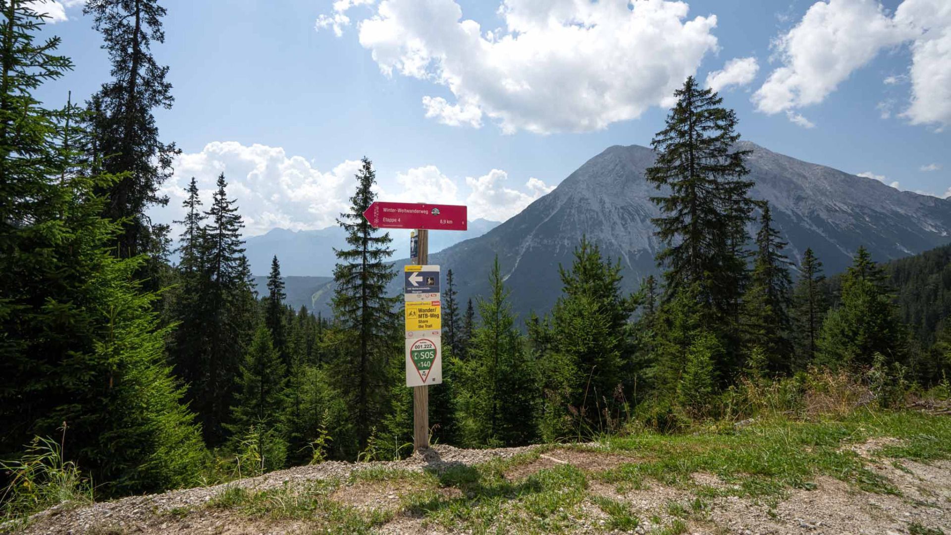 Achtung: Oberhalb der Waldgrenze bei der Abzweigung, etwa 100 HM unterhalb der Wettersteinhütte und der Wangalm sollte man die Räder stehen lassen und den letzten Abschnitt zu Fuß bewältigen. Ab hier wird der Weg sehr steil und grobschotterig. Bei Weidevieh bitte Abstand halten und das Weidegebiet ruhig und zügig durchqueren.