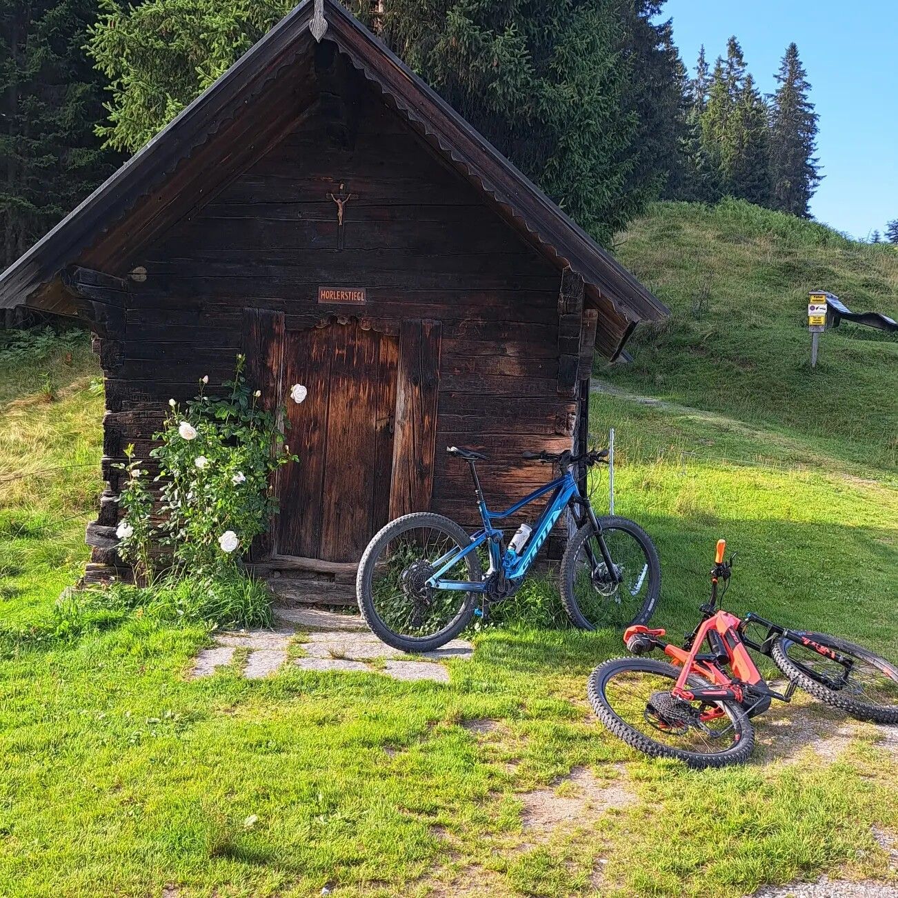 An der Bergstation fährt man rechts weg, Richtung Holzalm. Achtung: Ab dem Wald ist Fahrverbot für Räder. Im Sommer ist der Weg bis zur Holzalm viel begangen. Fußgänger haben Vorrang - das Rad bitte schieben.