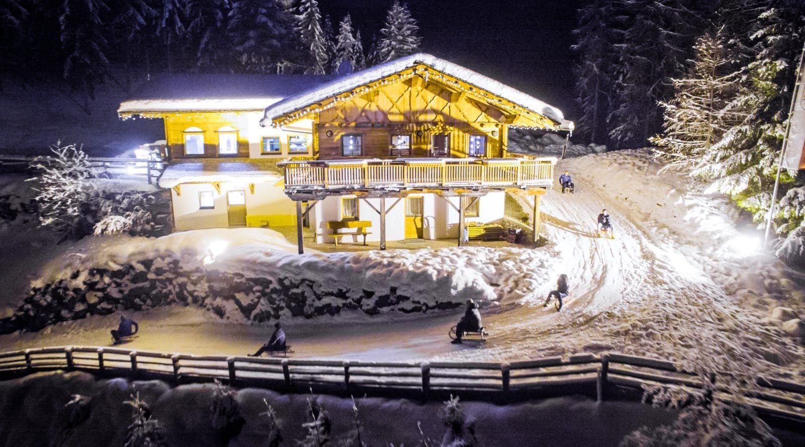Die Rodelbahn Würfelehütte im Virgental in Osttirol ist unser Klassiker – keine Aufstiegshilfe, dafür aber eine romantische Hütte mit direktem Rodelverleih und eine jeden Abend beleuchtete Rodelbahn.