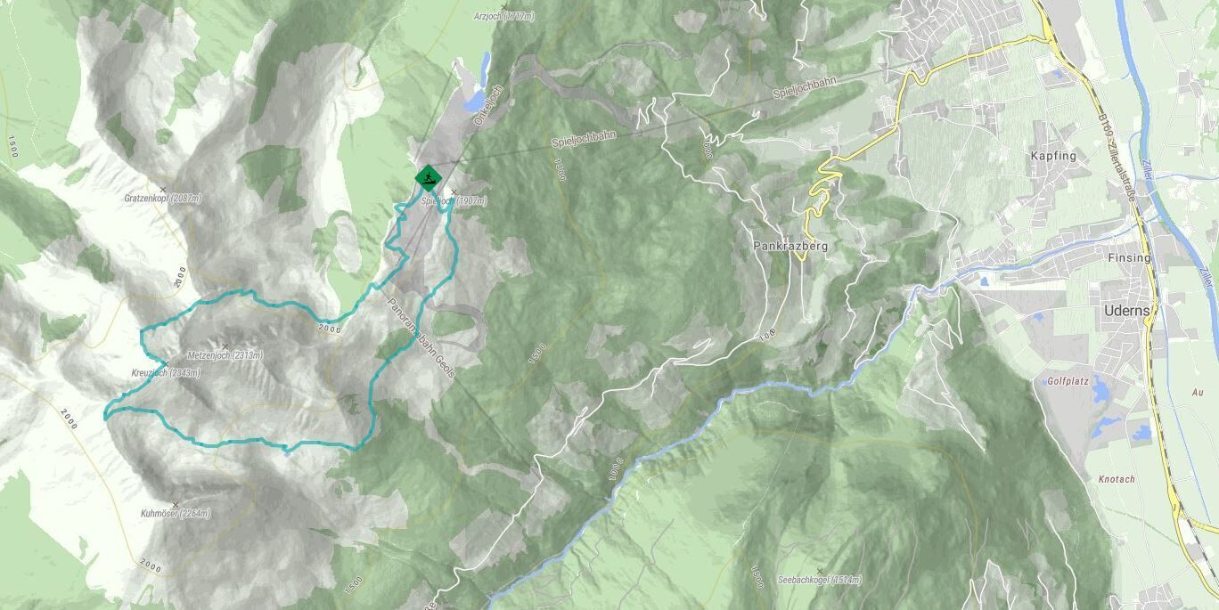 Von der Bergstation der Spieljochbahn folgt man zunächst ca. 200 hm dem Forstweg hinauf zur Geols