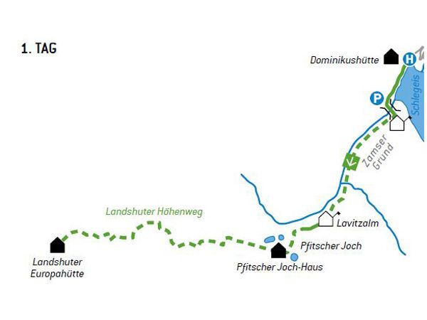 Wir starten unsere Bergtour direkt bei der Bushaltestelle an der Staukrone des Schlegeisstausees und wandern zu Beginn ca. 15 Minuten auf der Straße bis zum südlichen Parkplatz, erreichen rechts hinter der Brücke die Jausenstation Zamsgatterl. Eingerahmt von steilen Bergflanken, steigen wir sanft durch den Zamser Grund und entlang des Zamser Baches, der von zahlreichen Seitenbächen gespeist wird, in südliche Richtung auf. Nach gut einer Stunde erreichen wir die urige Lavitzalm, auf der man sich eine kleine Stärkung gönnen und die Naturpark-Ausstellung „pfitscherjoch grenzenlos“ besichtigen kann. Von der Alm wandern wir durch die moorige Hochebene und entlang des wildflussartigen Abschnitts des Zamser Baches weiter und gelangen über den „Jochschinder“ nach etwa 30 bis 45 Minuten zum Stampflerboden, wo wir mit dem Passieren der alten Zollwachhütte Südtiroler Boden betreten. Schon kurz danach zweigt rechterhand der Landshuter Höhenweg ab. Für einen Abstecher zum Pfitscher Joch-Haus (2.277 m) müssen wir unsere Wanderung noch für ein paar Minuten in Richtung Süden fortsetzen. Nach einer Rast beim Schutzhaus kehren wir zur Abzweigung zurück und folgen dem Landshuter Höhenweg in westlicher Richtung. Vorbei an kleinen Lacken und Seen, genießen wir die Ausblicke auf die hohen Gipfel der Zillertaler Alpen und die steilen Gipfel der Pfunderer Berge. Der Höhenweg schmiegt sich durchwegs sanft an die Bergflanken der Hohen Wand, der Kluppe und des Kraxentragers an, zieht sich durch weitläufige Kare und endet nach zweieinhalb bis drei Stunden Gehzeit bei der Landshuter Europahütte (2.713 m).