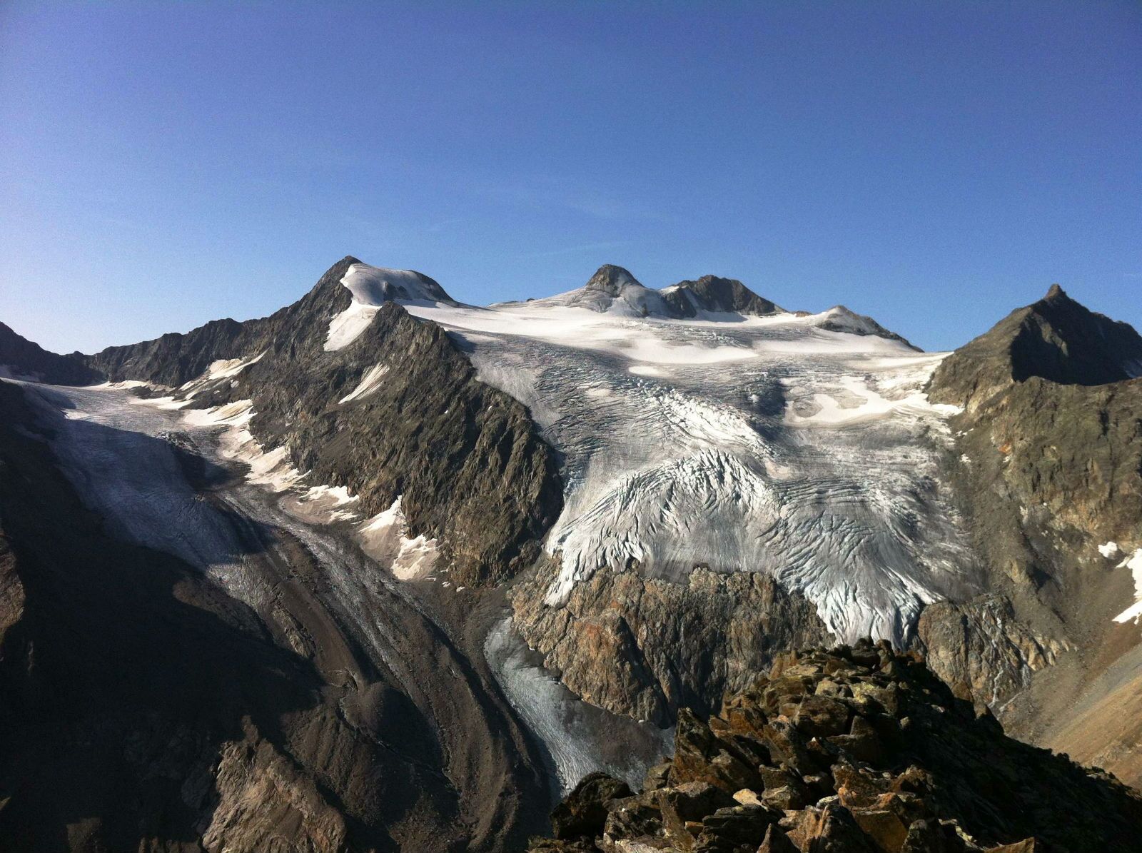 Selten in den Alpen können wir auf so geringer Distanz eindrucksvoll die verschiedenen Erscheinungsbilder der Gletscherlandschaft bestaunen: den Moränensee "Blaue Lacke" knapp oberhalb der Hütte, die bunten Gletscherschliffe, den milchigen Gletscherbach, einen Gletschersee und ein Gletschertor am Fuß des flach dahin fließenden Sulzenaugletschers mit kleinen Rinnsalen und Gletschermühlen, darüber eine Felswand mit zahlreichen kleinen Wasserfällen. Hoch oben thronen bewegungslos die zerklüfteten Türme des Gletscherbruchs des Sulzenauferners und ganz oben die kleine Schneekuppe des höchsten Berges der Stubaier Alpen, dem Zuckerhütl. Angenehm ist, dass wir all dies in nächster Umgebung der Hütte auf guten Wegen erkunden können. Kein Wunder, dass die Gegend ein beliebtes Ziel für Schulklassen geworden ist.