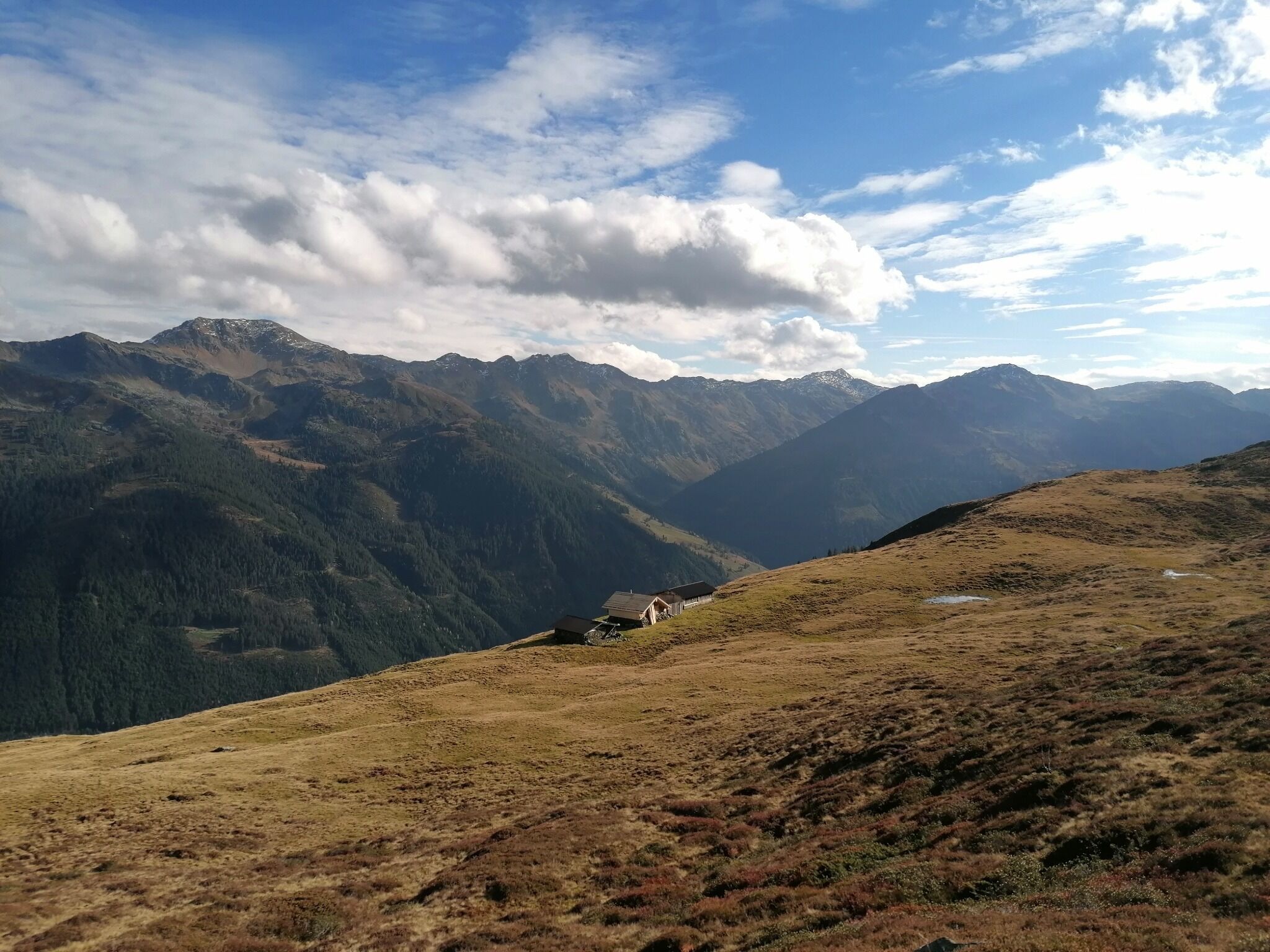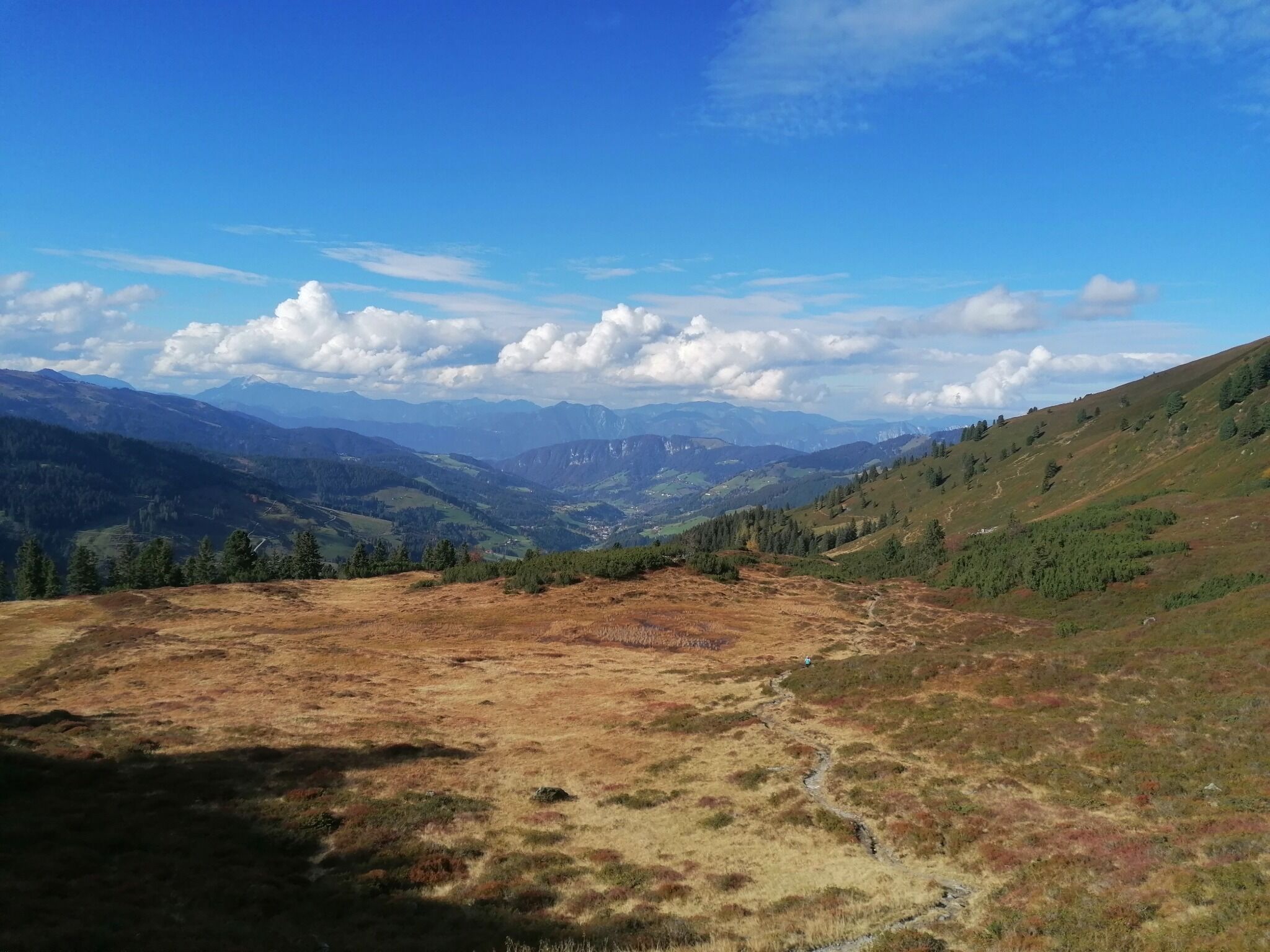 Weiter geht es über moorige Flächen und später bergauf zum Siedljoch (Übergang ins Nachbartal Kelchsau) . Nun dreht der Weg Richtung Norden , vorbei am Hengstkogel bis zur Breiteggspitze. In leichtem Auf und Ab passiert man viele Latschen und Lärchenwald, immer mit schönen Ausblicken in das Wildschönauer und Kelchsauer Tal zu beiden Seiten. Speziell im Herbst bietet sich hier eine besonders farbenprächtige Landschaft.