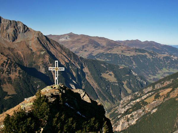 Am Gipfel auf 2.396 m sticht uns im Süden der Ochsner ins Auge, auf der anderen Talseite steht der Dristner als grüner abweisender Wächter hoch über Ginzling. Im Hintergrund leuchten die weißen Spitzen der hohen 3000er der Zillertaler Alpen. Gegenüber legt sich das Federbettkees wie eine flauschige Decke über den Nordosthang des Hohen Rifflers. Voll beladen mit diesen Eindrücken begeben wir uns beim Abstieg mit großer Achtsamkeit zurück in den Talboden der Gunggl.