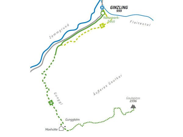 Wir starten direkt in Ginzling bei der Bushaltestelle vor dem Naturparkhaus. Entweder bummeln wir gemächlich über die Asphaltstraße taleinwärts, bis wir nach 800 m bei einem Hinweisschild auf den Weg Nr. 522 abzweigen. Wer die Straße meiden möchte, kann auf den Ginzlinger Rundwanderweg einbiegen, der direkt hinter dem Naturparkhaus beginnt. Er verläuft kurz auf der kleinen Straße ins Floitental und zweigt bei der „Bergstation“ des kleinen Schleppliftes in Gehrichtung rechts ab und schlängelt sich durch den verzaubert anmutenden Fichtenblockwald. Ohne großen Höhenverlust mündet der Weg dann in den Wanderweg hinauf zur Maxhütte. Nach ein paar Metern auf der Forststraße taucht man in ein Meer aus Fichten ein, das uns nicht mehr freigeben wird, bis wir die Höhenstufe überwunden haben, die den Talboden vom Hochtal trennt.
