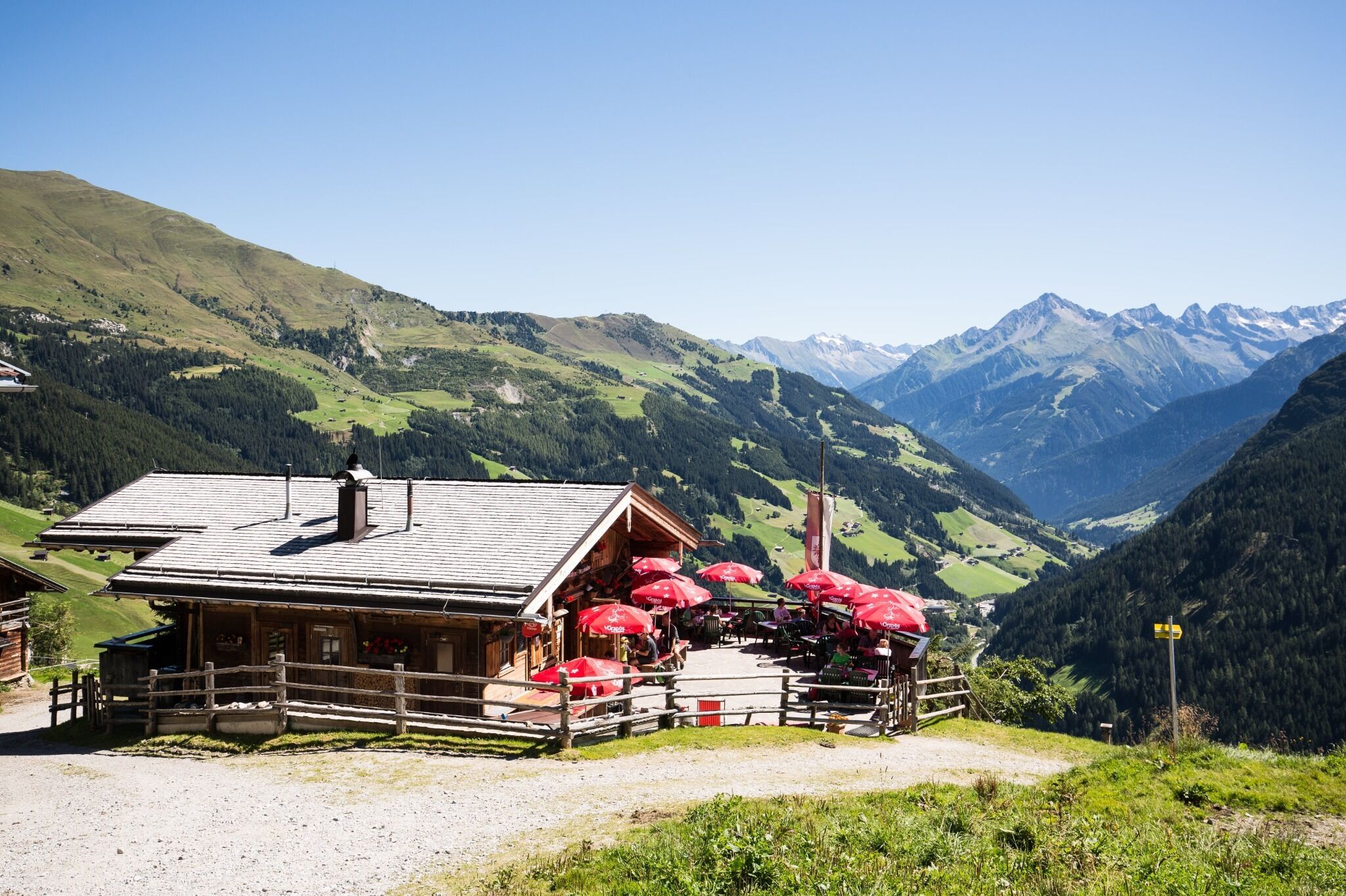 Oberhalb der Talstation zeigt uns der Wegweiser den Bergpfad Nr. 21 Richtung Gemais talauswärts. Ab der Rosenkranzkapelle folgen wir dem Forstweg bis zur Abzweigung links bergan zur Lattenalm, Weg Nr. 33. Nach der urigen Hütte wandern wir auf dem breiten Almweg Nr. 39 weiter bis zum Eggalm-Niederleger, unterhalb der Bergstation Eggalm Bahnen. Dort nehmen wir den teils steilen Bergpfad Nr. 23 talwärts nach Tux-Lanersbach.