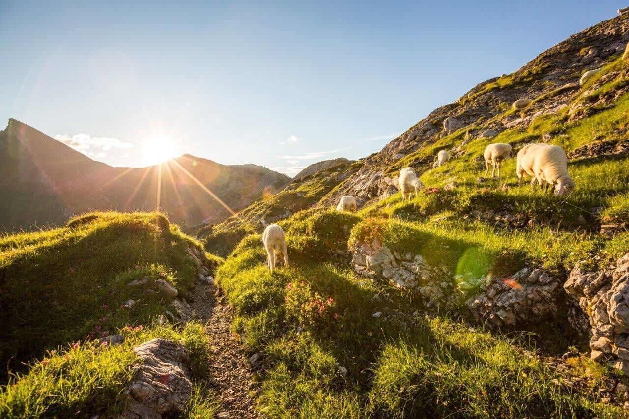 Früh machen wir uns auf, um einen der ganz großen Höhepunkte des gesamten Grenzgänger-Weges zu bestaunen: den Schrecksee. Diesen Anblick müssen wir uns aber zunächst mit mehreren Auf- und Abstiegen verdienen: Zunächst geht es nach der Übernachtung in Hinterstein wieder hinauf zur Willersalpe und dann steil und teilweise etwas anspruchsvoll hinauf zum Geißeckjoch, von wo wir nicht nur den herrlichen Vilsalpsee von oben sehen können, sondern auch unser Etappenziel, die Landsberger Hütte erahnen können. »So weit noch!?« wird man erstaunt feststellen! Aber der Tag ist noch lang und der Weg wunderschön. Unterhalb des felsigen Rauhhorns gelangen wir in das nächste Joch, von dem wir nun das erste Mal den Schrecksee erblicken können. Nur schwer lösen wir uns einige Kilometer später von diesem sagenhaften Anblick, aber wir müssen weiter! Wieder wechselt unser Blick am nächsten Sattel. Durch eine sanfte Graslandschaft erreichen wir unseren letzten Übergang für heute, das westliche Lachenjoch, das uns endlich den Blick auf unser Etappenziel ermöglicht. Während die Füße die verdiente Pause genießen, bleibt Zeit, von der Sonnenterrasse der Landsberger Hütte aus die düstere Nordwand der Lachenspitze mit ihrem anspruchsvollen Klettersteig zu bestaunen.