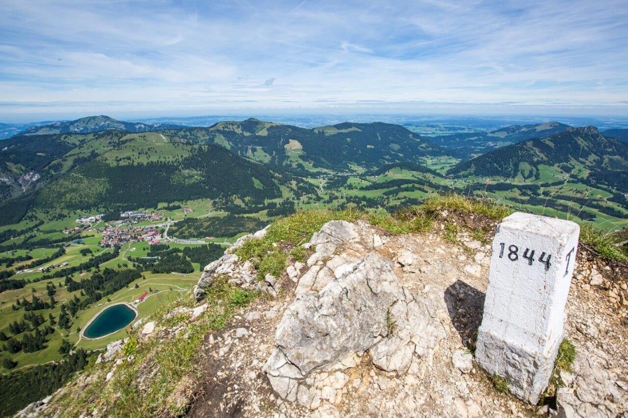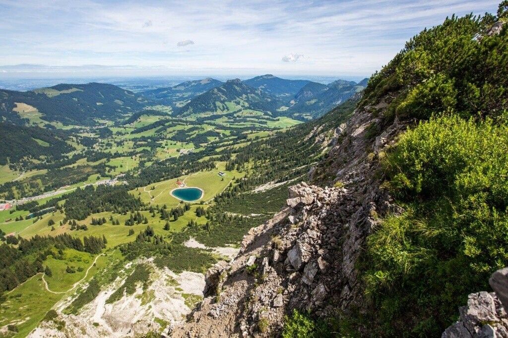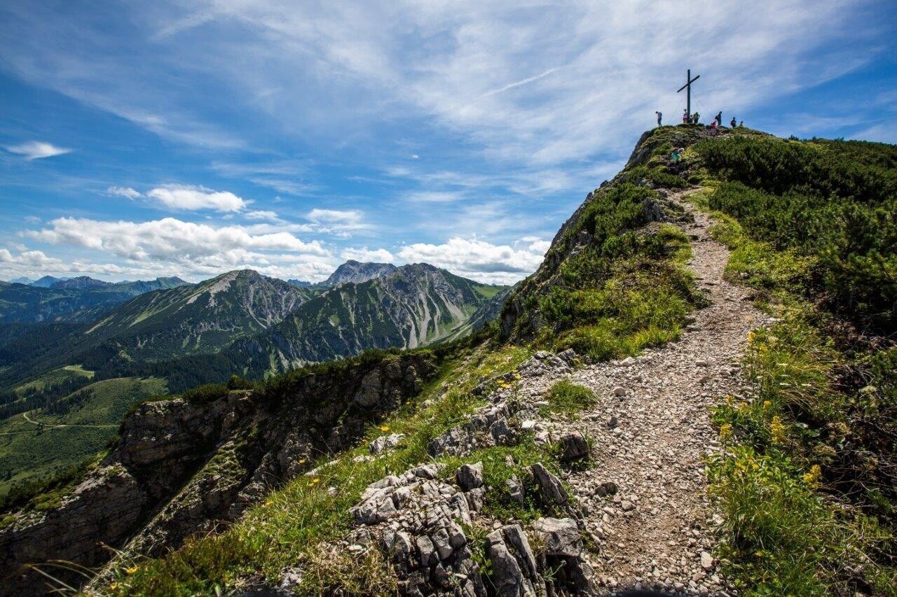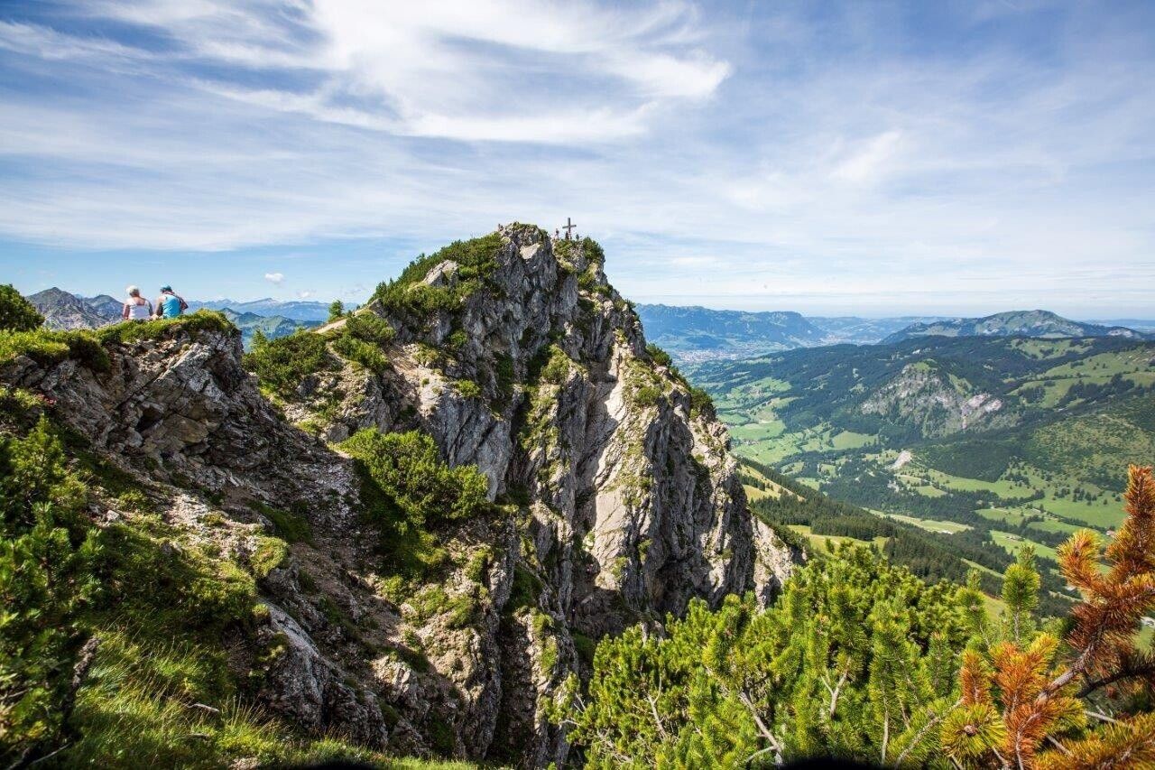 Der sechste Tag auf dem Grenzgänger führt uns ein letztes Mal über die Grenze. Zunächst wartet aber ein imposanter Wasserfall gleich zu Beginn der Etappe. Weiter geht es durch herrlichen Wald und ausgedehnte Wiesen zur Zipfelsalpe, auf deren aussichtsreichen Terrasse die Brotzeit gleich doppelt so gut schmeckt. Die Gipfelhänge unseres ersten Ziels, dem Iseler, sind von hier aus bereits zu sehen. Weiter durch blumenreiche Wiesen gewinnen wir immer weiter an Höhe, bis wir am Gipfelgrat das erste Mal die Ortschaften Ober- und Unterjoch erkennen können. Wir folgen dem gesamten Gratverlauf teilweise ausgesetzt, teilweise steil, meist jedoch auf schönen Bergpfaden bis hinüber zum Kühgundkopf. Im Abstieg in Richtung Schattwald warten die letzten Drahtseile auf uns, bevor wir uns an der Wannenjochbahn entscheiden können, ob wir unseren Grenzgang mit einer gemütlichen Bahnfahrt ins Tal beenden oder aber die letzten Höhenmeter noch vollends zu Fuß zurücklegen möchten.Wegbeschreibung: