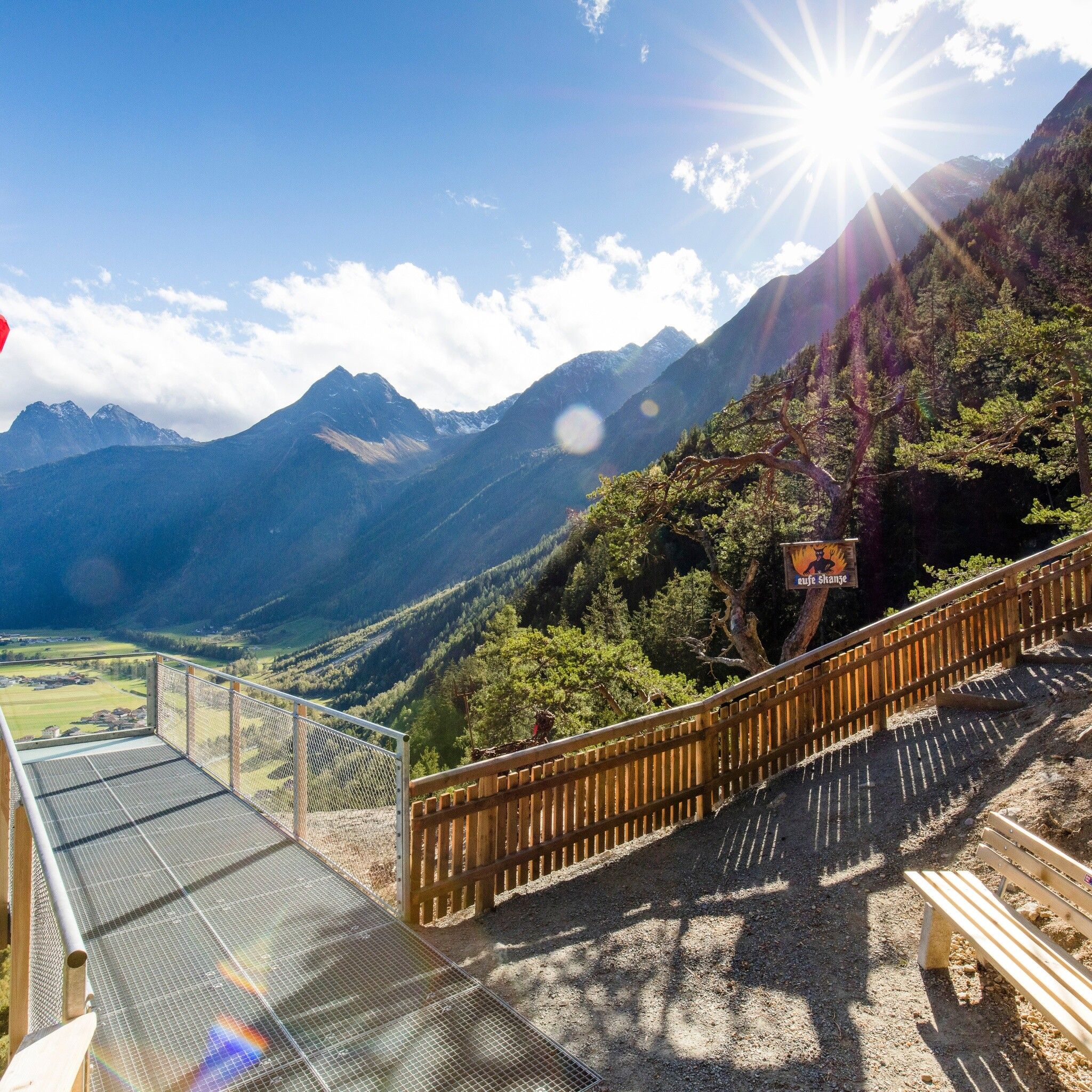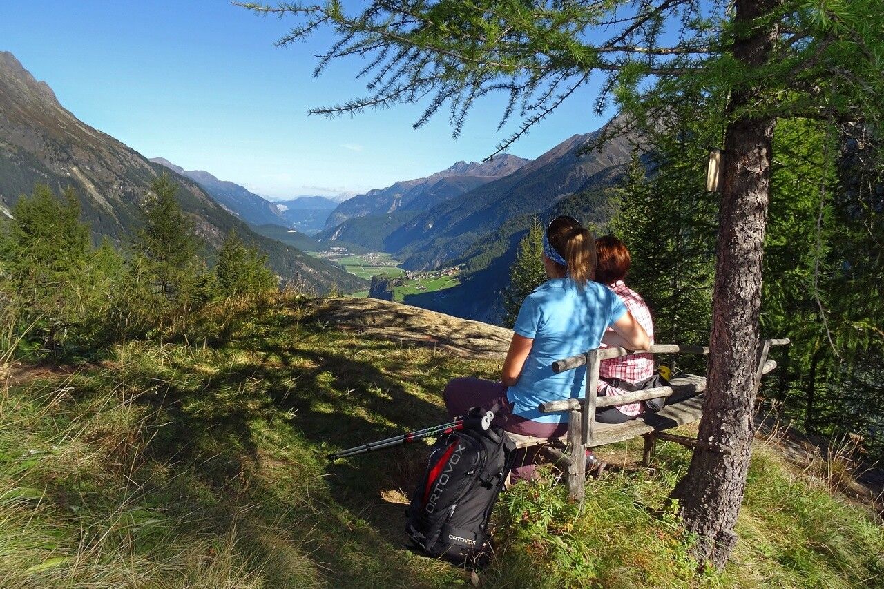 VON SÖLDEN ZU DEN LANGEN FELDERNEbenso ruhig und idyllisch gelegen wie Granstein, zeigt sich Hochwald. Ein kleiner Weiler nicht unweit von Sölden, umgeben von unzähligen Lärchenbäumen, an einer Waldlichtung. Hier bietet sich nochmals ein Blick zurück auf die Talmetropole mit der gigantischen Bergkulisse, der der dem Bild den richtigen Rahmen gibt. Der Weg führt vorbei am Wasser, der Wälder und kleinen Weilern, am Fuße der steilen Talseiten zwischen Sölden und Huben. Bei Huben führt der Weg vorbei beim Startplatz des Ötztaler Sagenweges, einer von 10 Kraftplätzen in Längenfeld. Über weitere Energiefelder führt der Duringweg, ein Höhenweg hoch über die kleinen Ortschaften und Weiler unten im Tal, ausgestattet mit vielen alten Bauernhöfen. Gebäude aus vergangenen Zeiten zeigen das Traditionsbewusstsein der Ötztaler. „Höllisch gut“ geht es uns dann auf der Teufelskanzel, der nächste Kraftplatz. Der Panoramablick hier oben überwiegt, gegenüber findet man in majestätischer Höhe die Hängebrücke zwischen der Brandalm und Burgstein.
