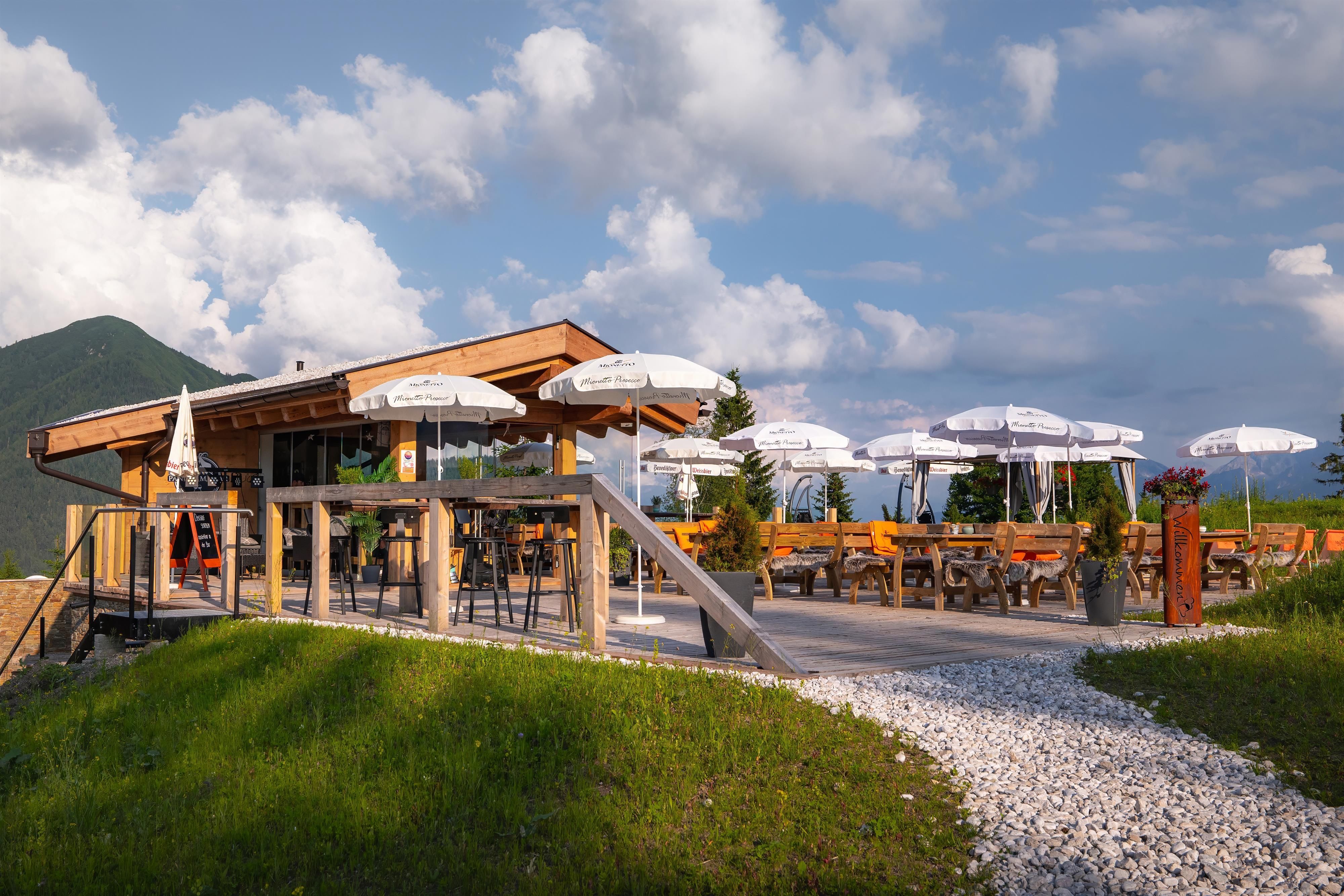 Dann links an der Sportalm und dem Sportplatz vorbei, dem Weg durch die Arena365 folgen. Nach dem Sportplatz in ansteigenden Serpentinen über den sogenannten Sommerweg durch den Seewald weiterspazieren. An der nächsten Lichtung liegt rechter Hand weit unterhalb des Wanderwegs die gemütliche Seewaldalm - nur im Winter geöffnet. Den Wanderweg bis zum Fuße des Gschwandtkopfs weiterspazieren und dann links der Beschilderung durch den Lärchenwald Richtung Auland folgen. Wer die Runde verlängern möchte, kann hier den Anstieg zur Sonnenalm am Gschwandtkopf angehen. Fast am Ende des Lärchenwalds bietet sich dann eine Rast in der aussichtsreichen Enzian-Hütte an.