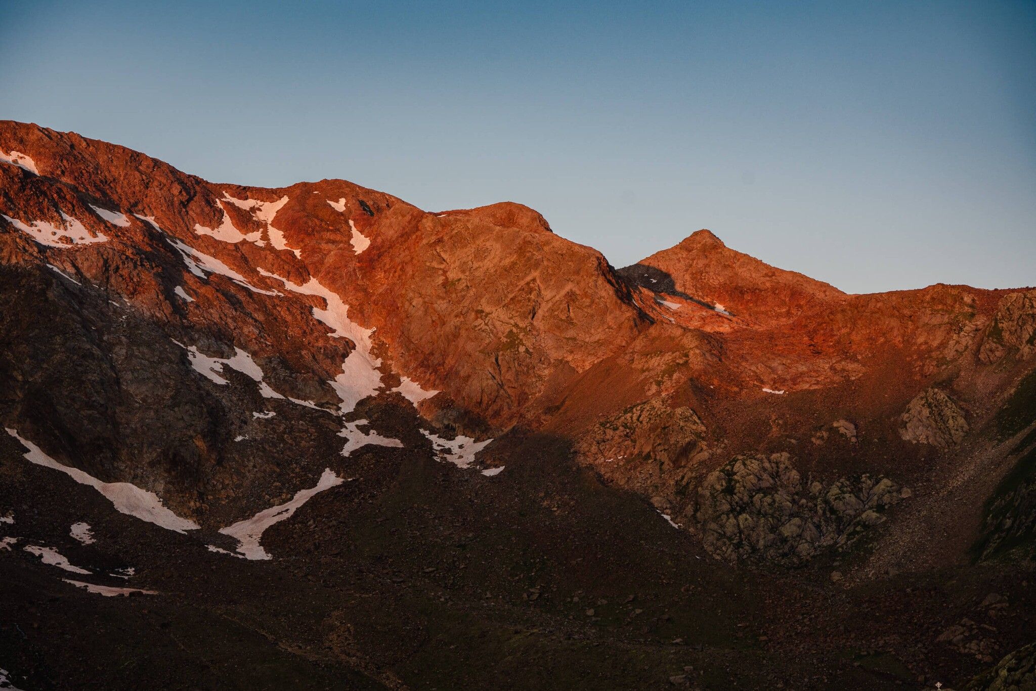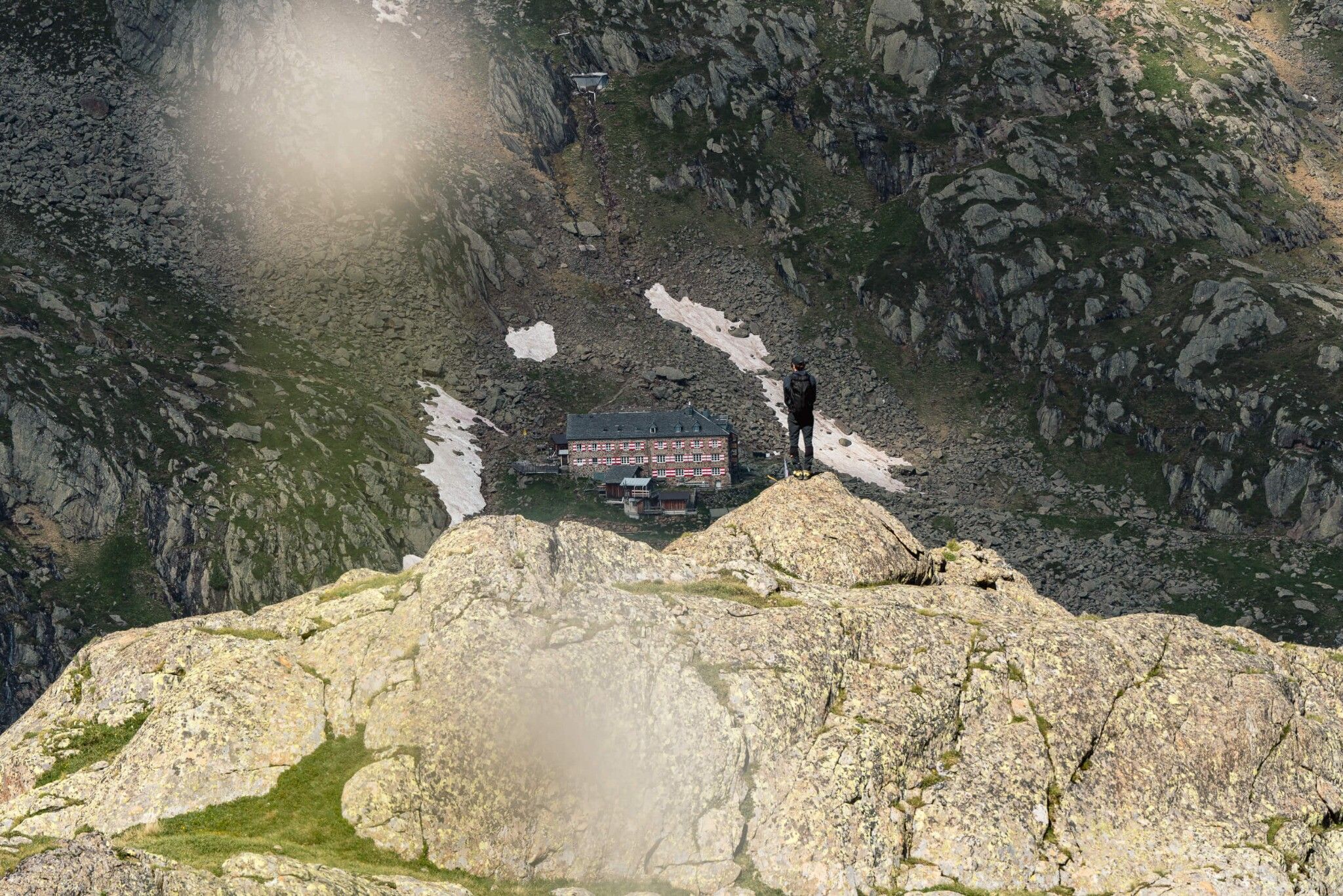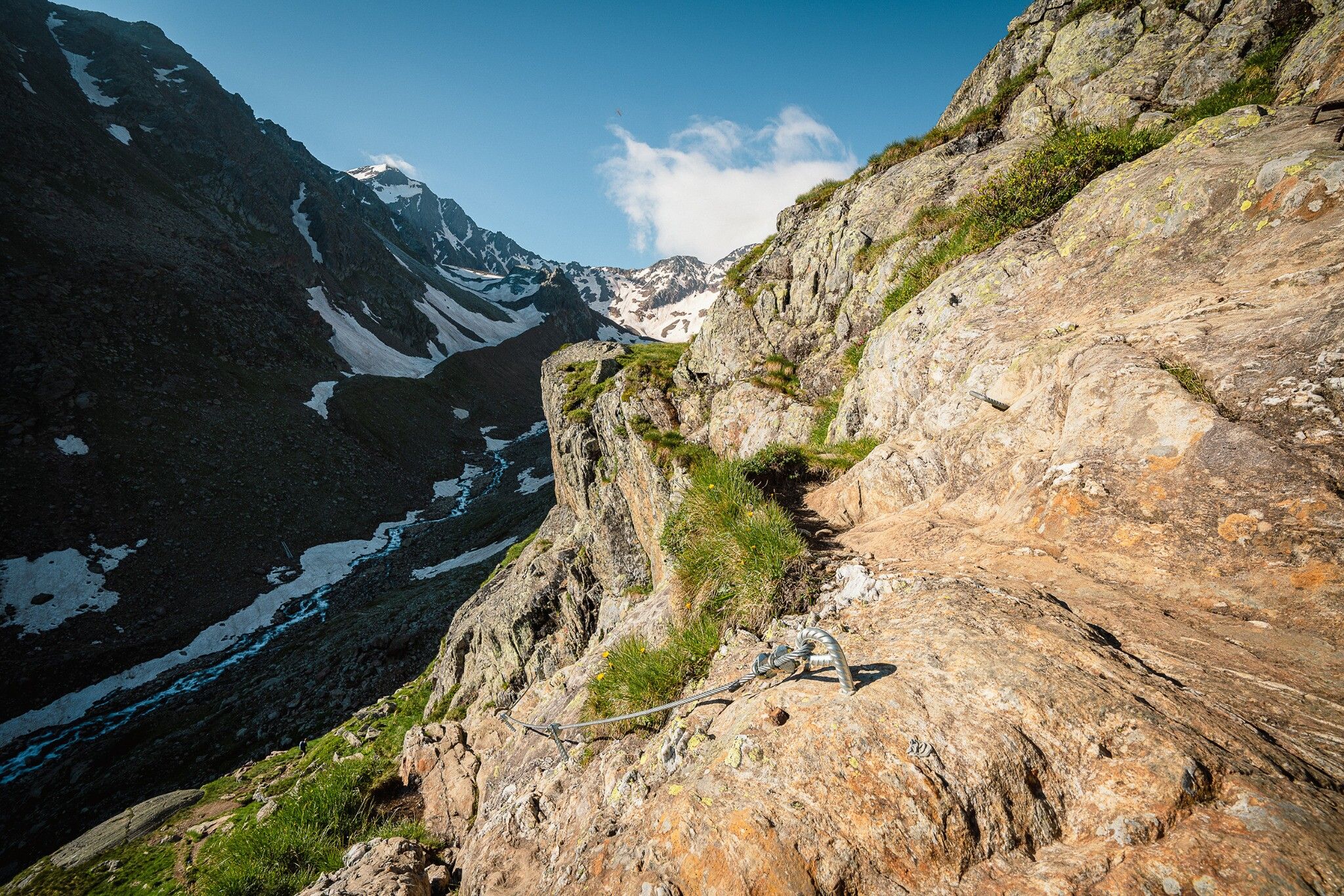 Es folgt ein langer, serpentinenreicher Abstieg mit einzelnen gesicherten Passagen bis zum Fuße eines Gletscherbaches. Nicht mehr weit von der Nürnberger Hütte entfernt, folgt noch ein kurzer Anstieg. Die letzten Meter sind sehr flach und somit leicht begehbar.