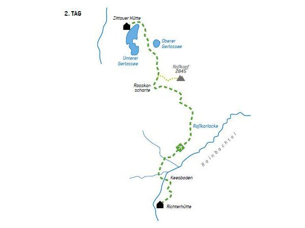 Von dort können wir mit der Zittauer Hütte bereits unser heutiges Tagesziel erblicken. Unter der Gratschneide des Roßkopfes zu Beginn leicht in nordöstlicher Richtung, folgen wir dem Steig nun in nördlicher Richtung über schön kupierte und vom Gletscher geformte Hänge hinunter zum Unteren Gerlossee, über dessen Nordende wir die malerisch gelegene Zittauer Hütte (2.328 m) der AV-Sektion Warnsdorf-Krimml erreichen.