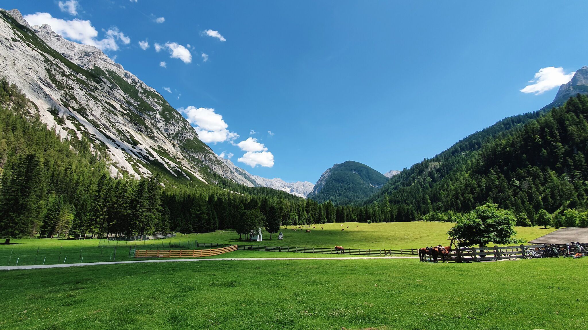 Die Wanderung durch die Gleirschklamm zur Möslalm beginnt am Naturpark-Infozentrum Scharnitz und führt zunächst entlang der Asphaltstraße Hinterautalstraße. Die Gleirschklamm liegt am Eingang des Naturparks Karwendel und beeindruckt mit ihrer ursprünglichen, nahezu unberührten Natur. Nach etwa 400 Metern biegen wir vor einem Haus auf den Isarsteig ab und folgen der Beschilderung „Gleirschklamm über Scharnitzer Alm“.