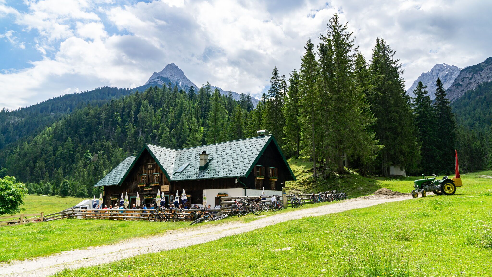 Der Isarsteig ist ein kurzer Waldpfad, der immer wieder schöne Ausblicke auf die Isar bietet. Am Ende des Steigs folgen wir der Beschilderung weiter zur Scharnitzer Alm, die sich ideal für eine gemütliche Einkehr eignet. Nach einer kurzen Stärkung setzen wir unsere Wanderung fort.